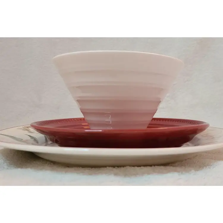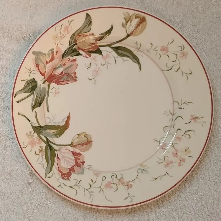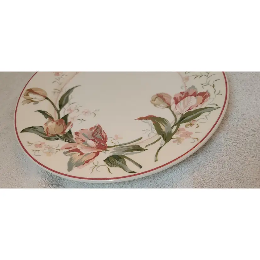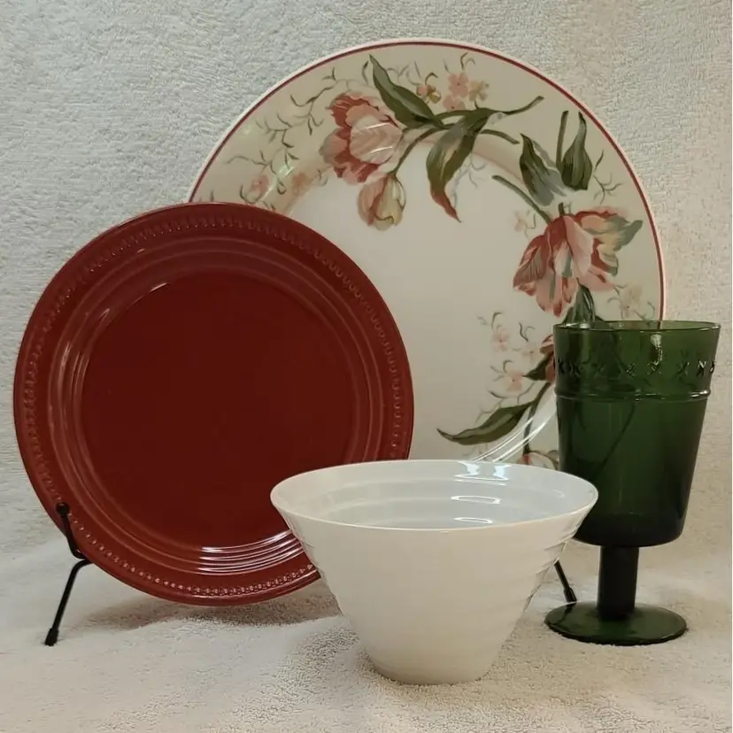This 4 piece place setting Classic Garden vibe. Each piece has a design different and complimentary to the next. The dinner plate is Waverly “Pink Tulips” with pinks, reds, grey and green. The salad plate Dansk “Mauve Speckled” in red with black/grey speckles is a great compliment to the dinner plate. The bowl has a great shape which mimics the ribs in the salad plate. The beverage glass deep green stemware reminiscent of carnival or pressed glass which compliments without distracting from the setting. MIX-052-004