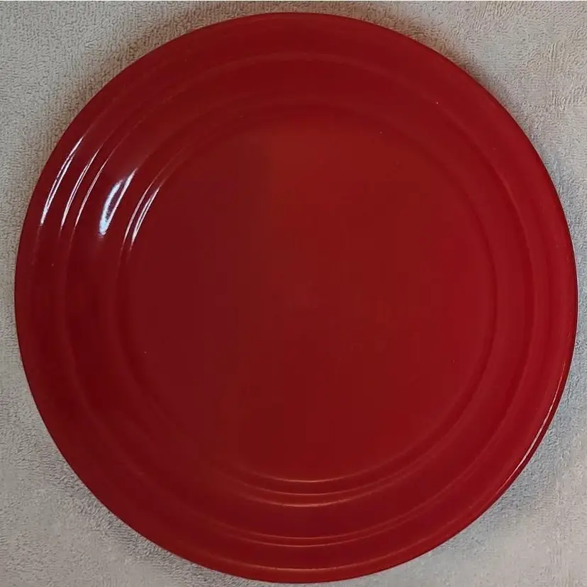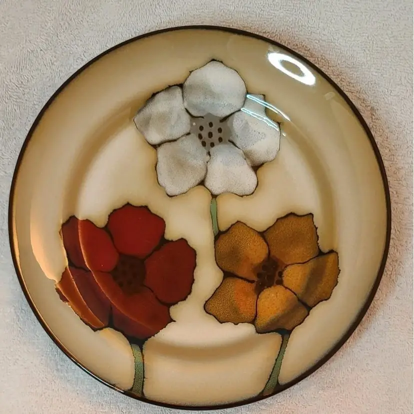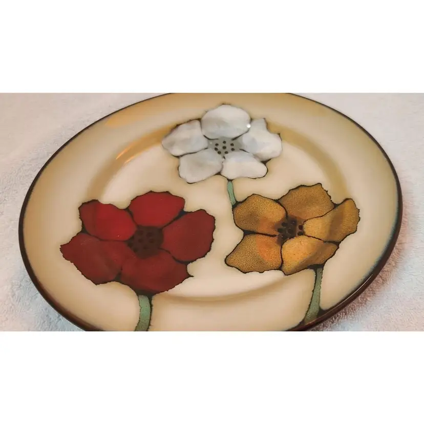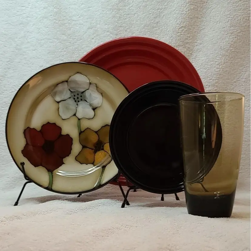 This 4 piece place setting Invigorating vibe with classic fall colors. Each piece has a design different and complimentary to the next. The dinner plate is Target Home “Red Ribbed”, classic color and appearance. The salad plate Pfaltzgraft “Painted Poppies” with vibrant red, tan and white poppies is a great compliment to the dinner plate. The Basic Black bowl with ribbed interior pulls from the Salad plate. The beverage glass is classic Brown with a “Murano” feel which compliments without distracting from the setting. MIX-051-004