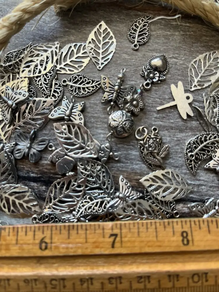 A mixed lot of silver tone charms. Mainly cut out leaves. Please see photos for the exact charms.