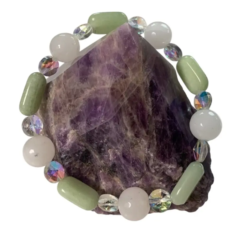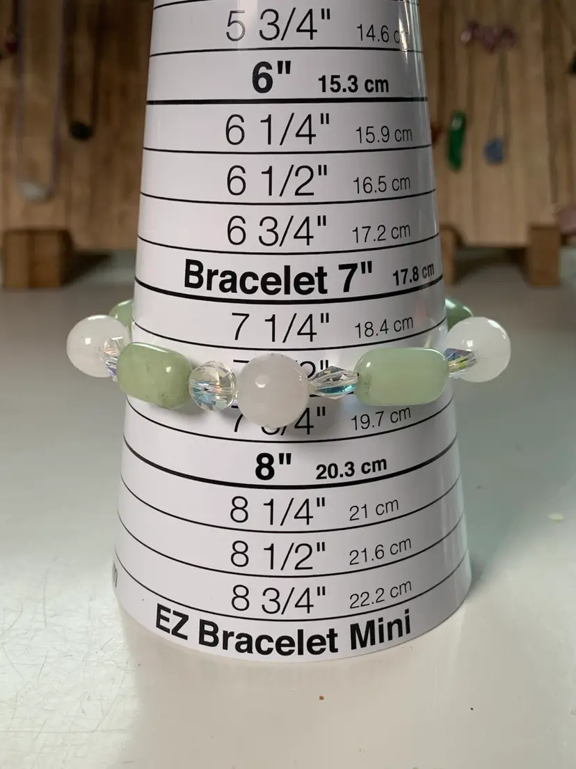 This beautifully crafted 7.5” large bracelet features a stunning mix of gemstones and crystals, creating a delicate yet eye-catching design. The combination of oblong pale green beads, micro-faceted opaque white beads, and sparkling rivoli crystal beads makes this a versatile piece that can be worn alone or stacked.
