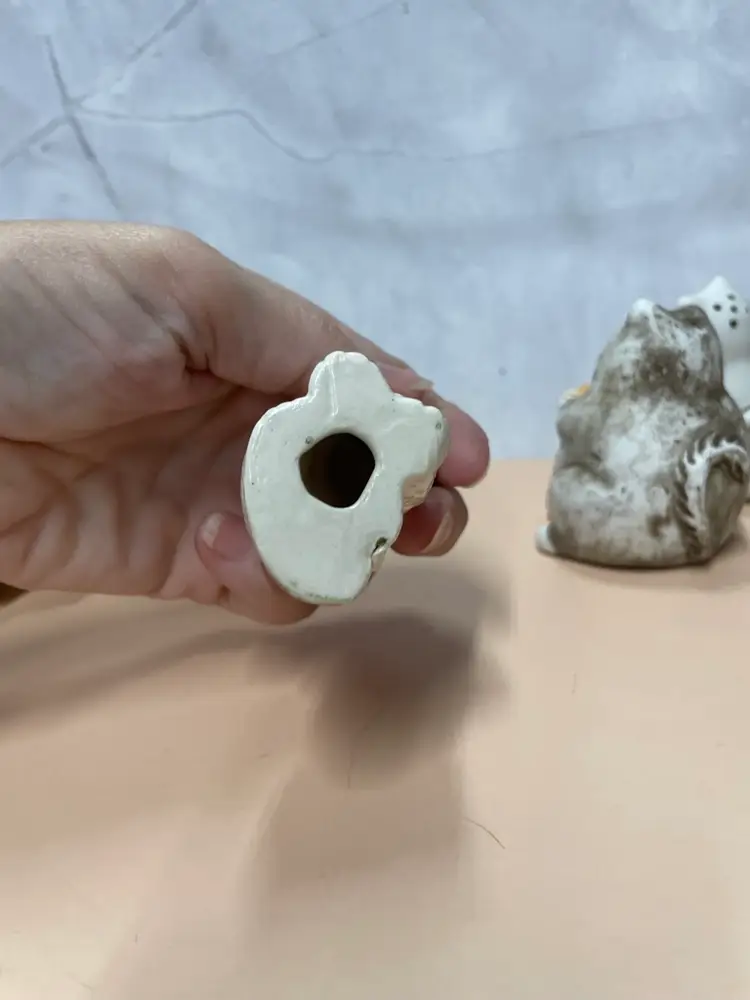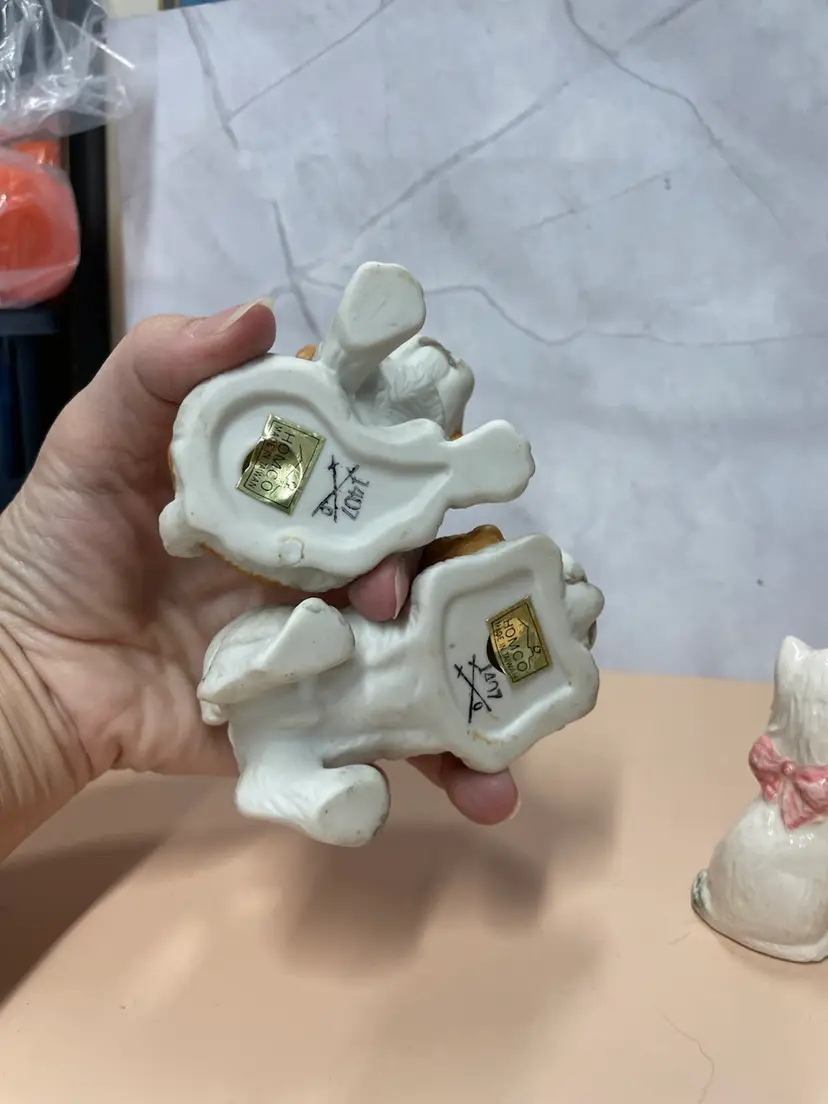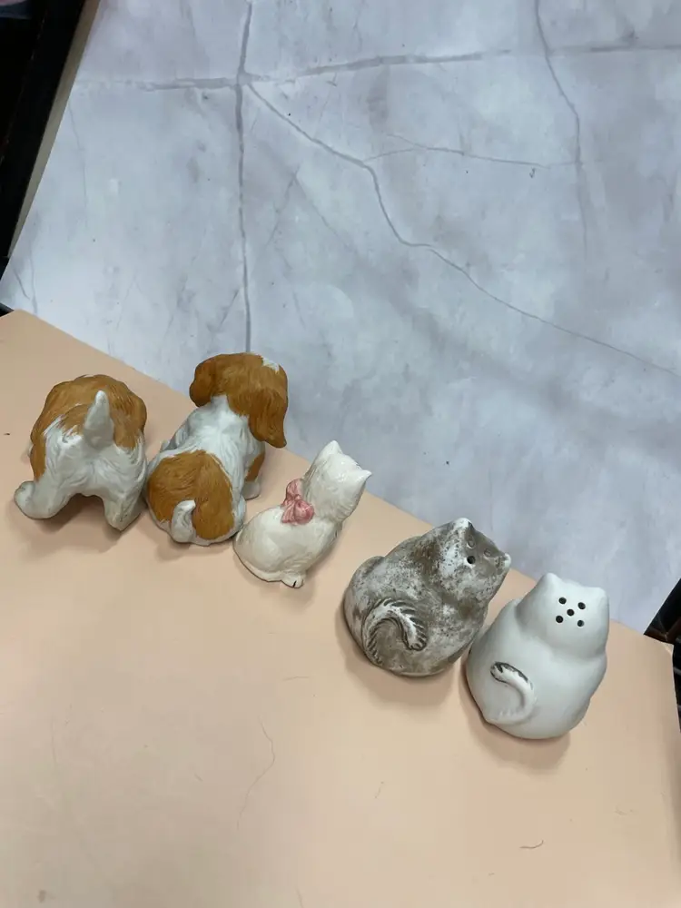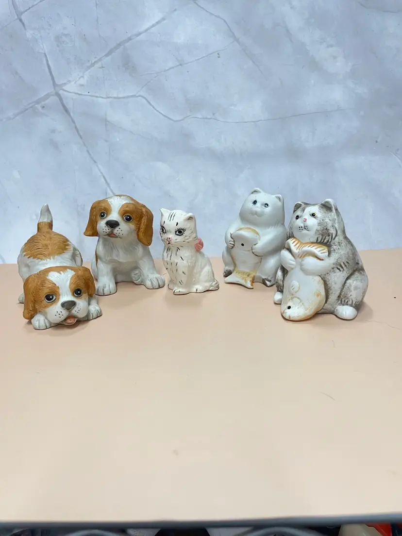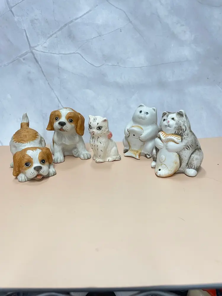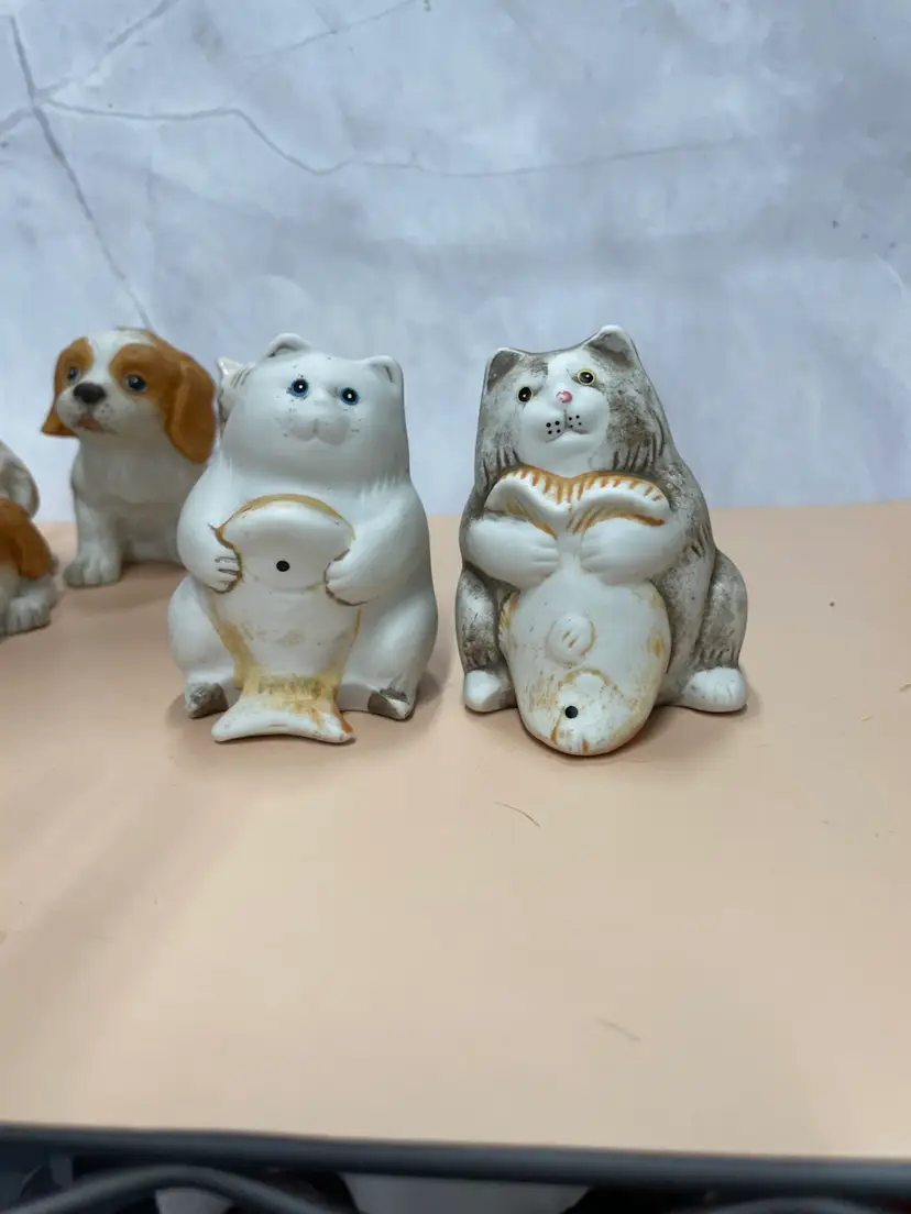 Mixed lot of ceramics. Salt and pepper shakers cats with fish. HOMCO playful puppies. And white ceramic cat.