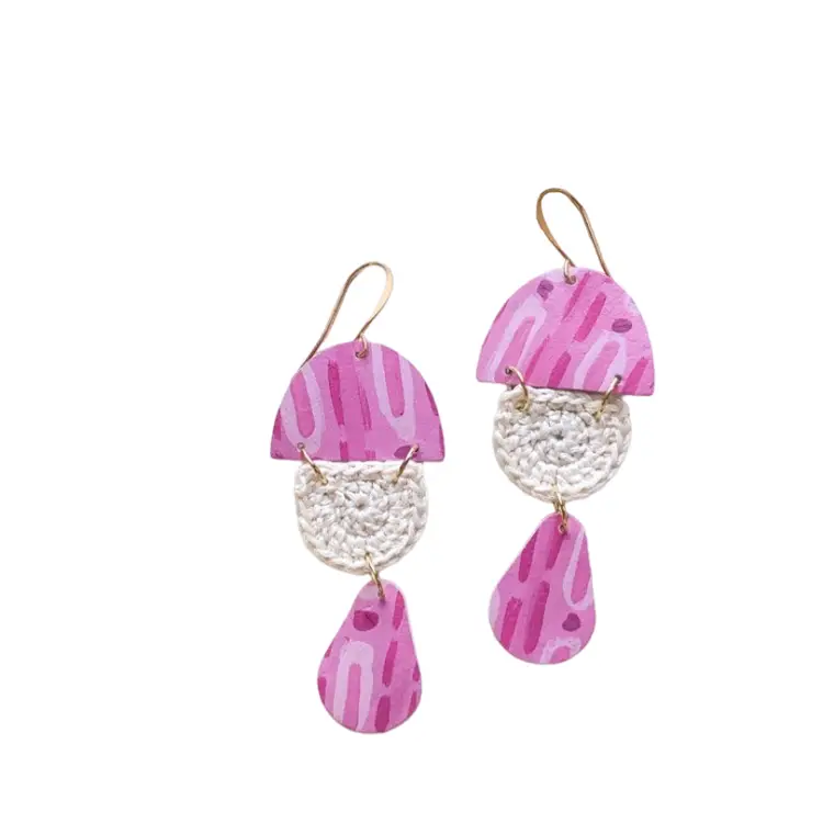 Fun dangly earrings! One of a kind design. Leather pieces Hand painted by Scandinazn and crochet pieces by Mountain Fable.
