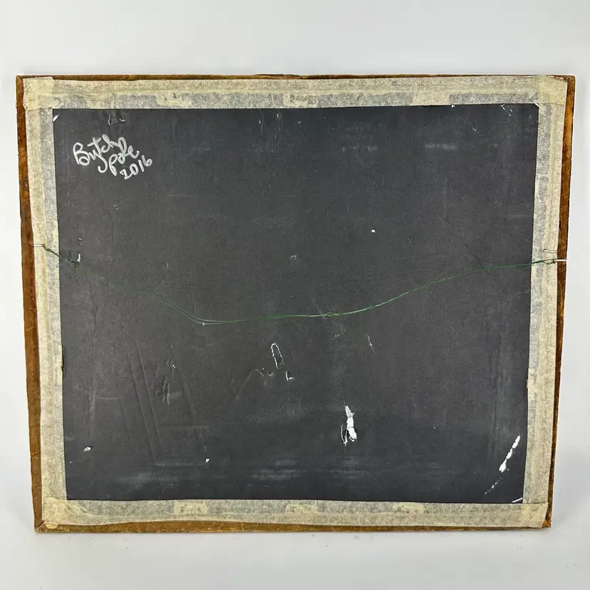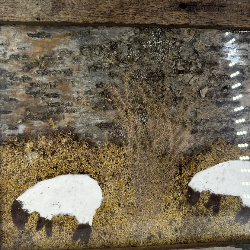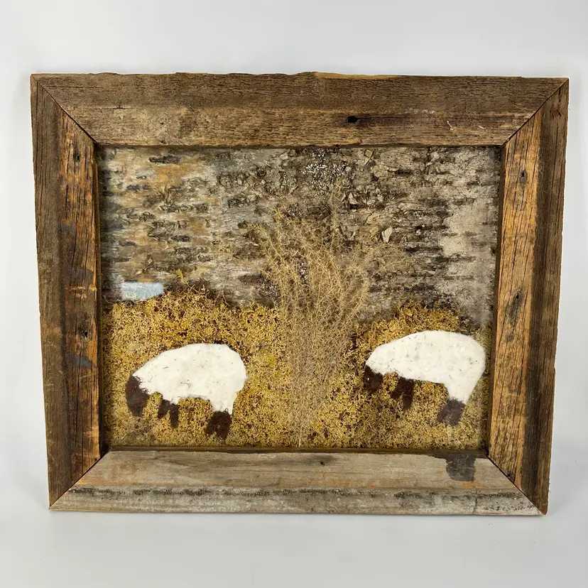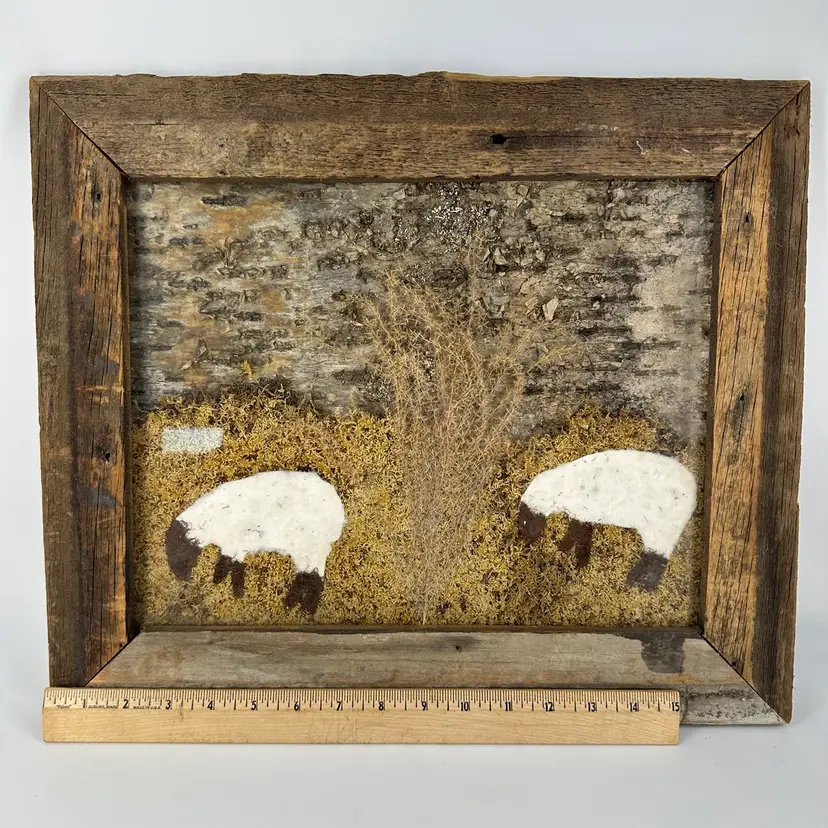 Wooden glass framed artwork featuring a sheep scene made of mixed media (moss, wood, cotton, etc). No breakage on frame or glass. Signed “Bytch Pole 2016” on the back. Has a wire hanger backing. Picture frame measures approximately 18” x 15.25”.