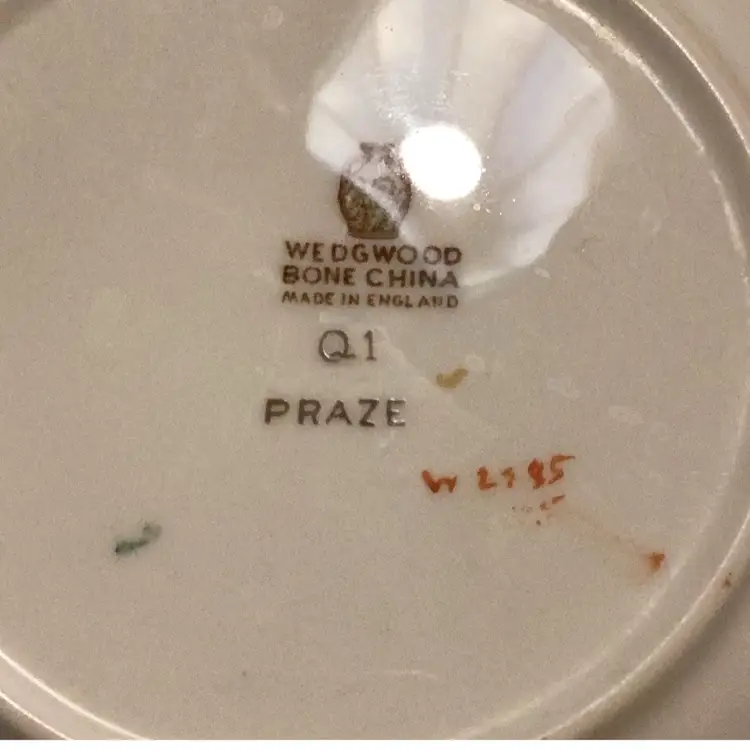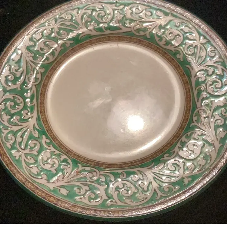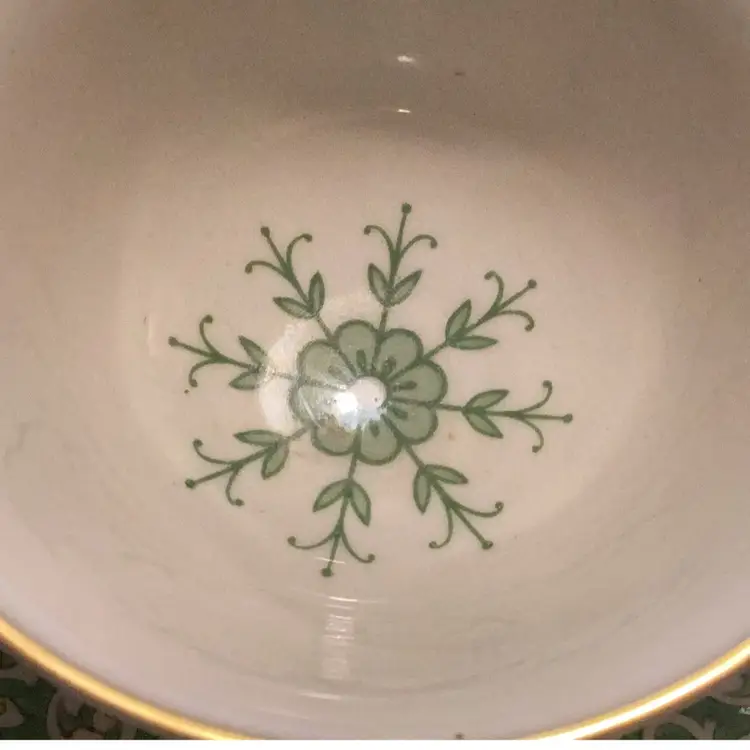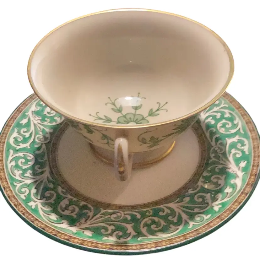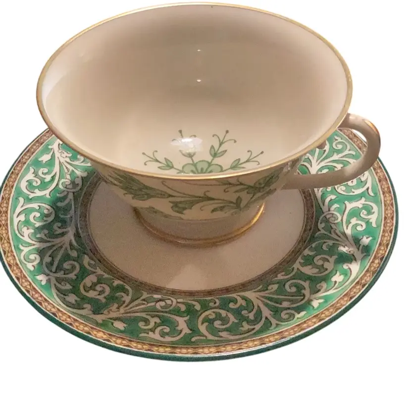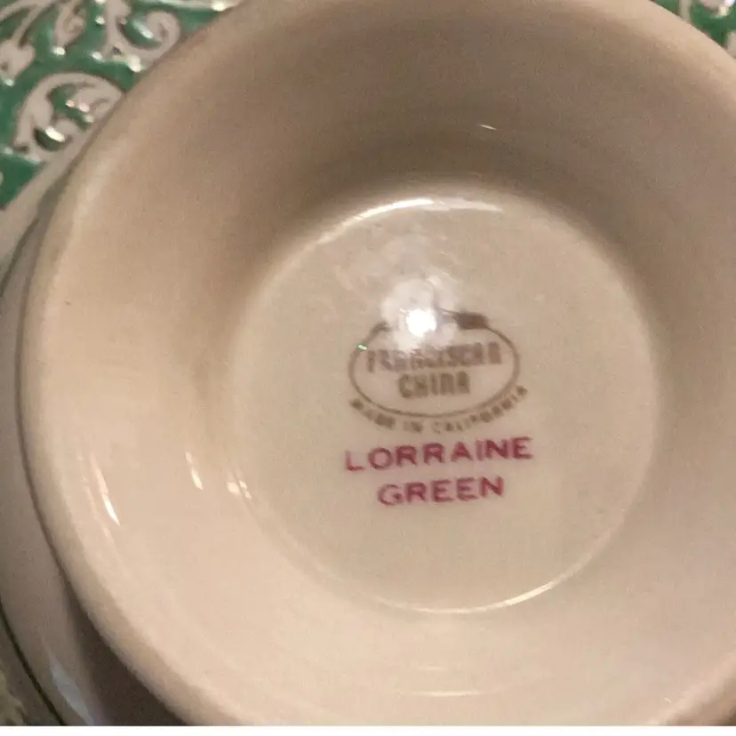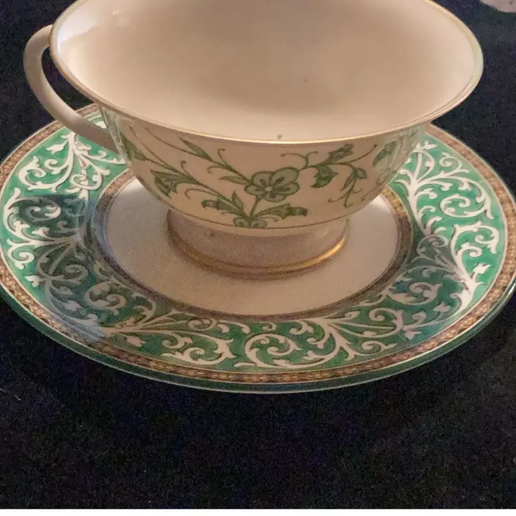Beautiful green and gold and white cup and saucer, the cup is from Lorraine Green Francisco China made in California, and the saucer is Wedgewood bone China made in England there’s numbers and letters on the bottom of the saucer. I think they look great together even though they’re a mixed hair they be great for coming up Saint Paddy’s day.