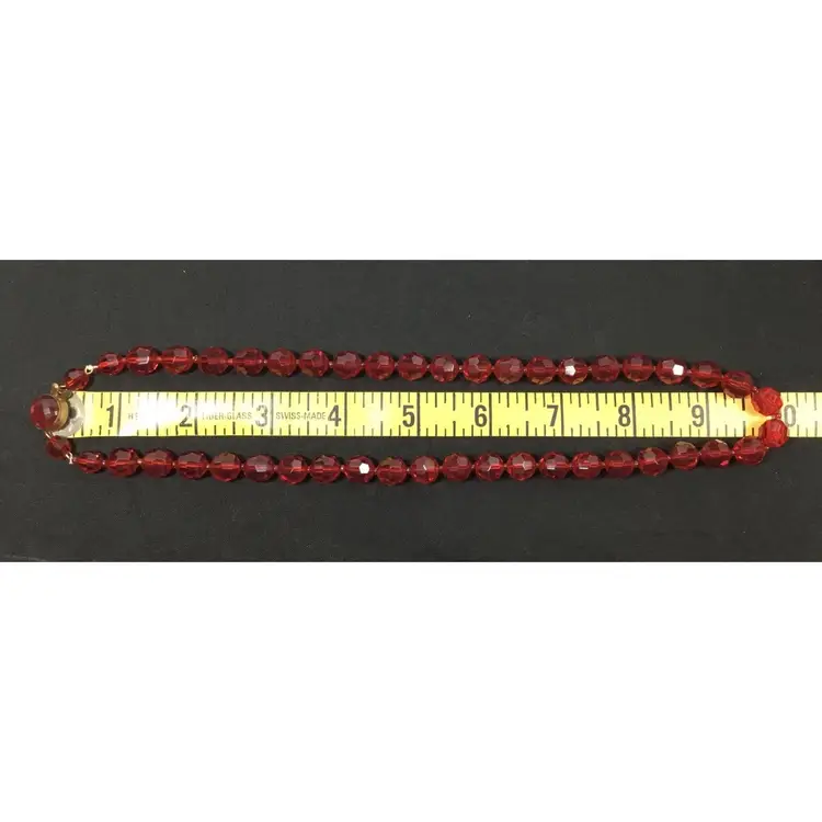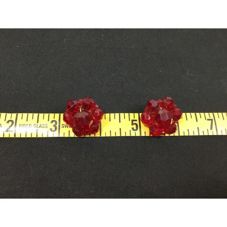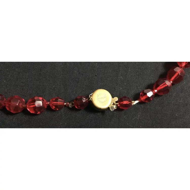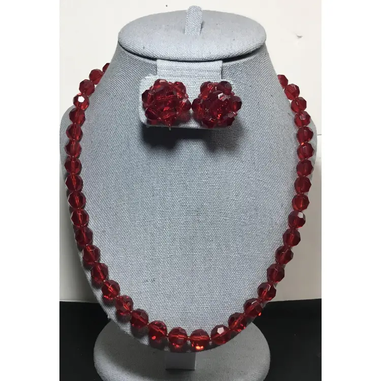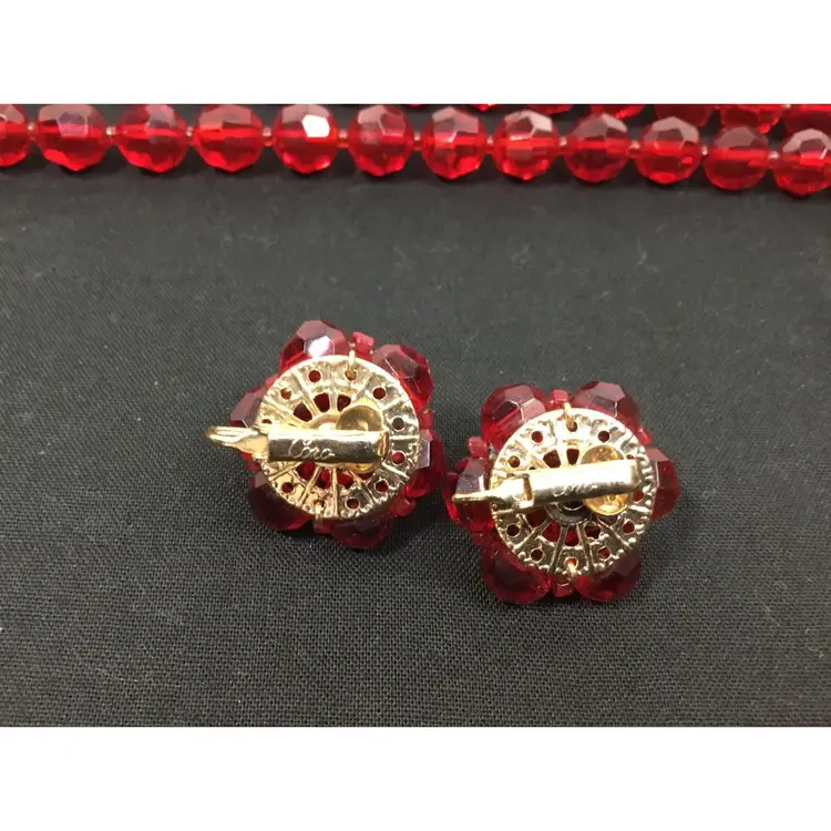 20 inch long, faceted red glass bead necklace spaced by matching color red seed beads. Necklace has white silk cording and vintage brass box clasp saying "Made in Western Germany." Clasp has multi-faceted, round glass bead set in brass bezel with small spots of tarnish. (Approx. 1945) Matching clip-on earrings, 1 inch wide with red, faceted glass beads and matching red color seed beads on twisted brass wires. Earrings have vintage Coro, clip-on backs. Earrings' twisted wires have verdigris.