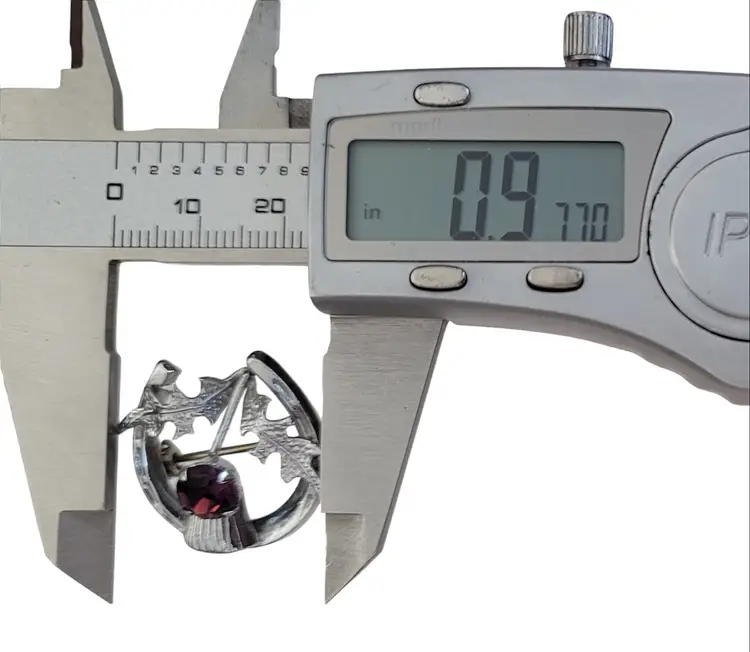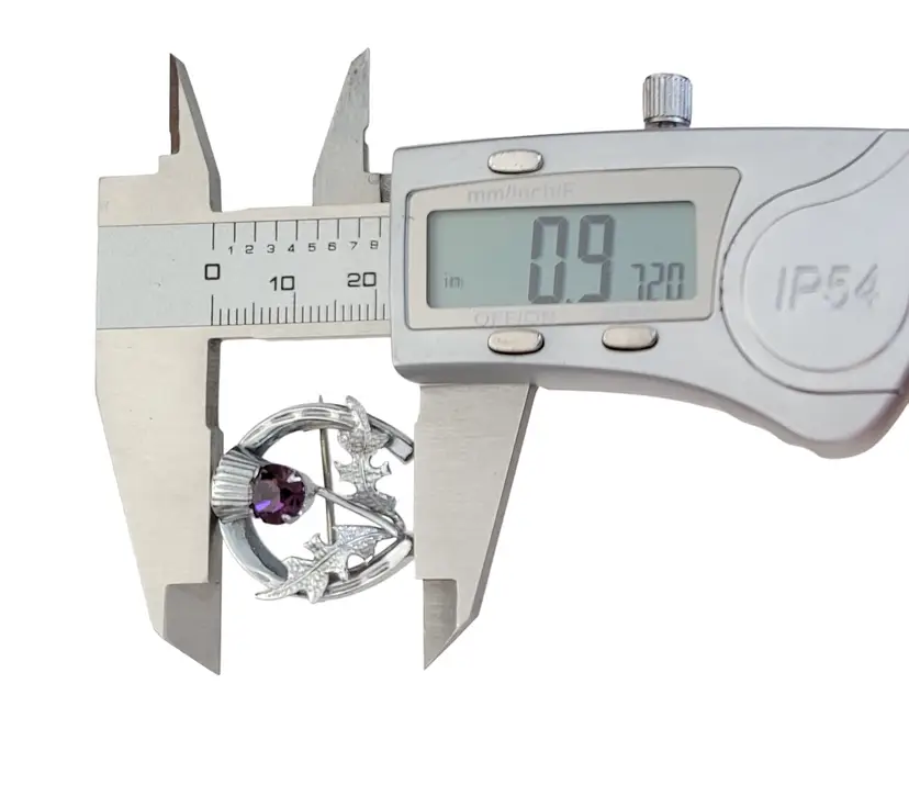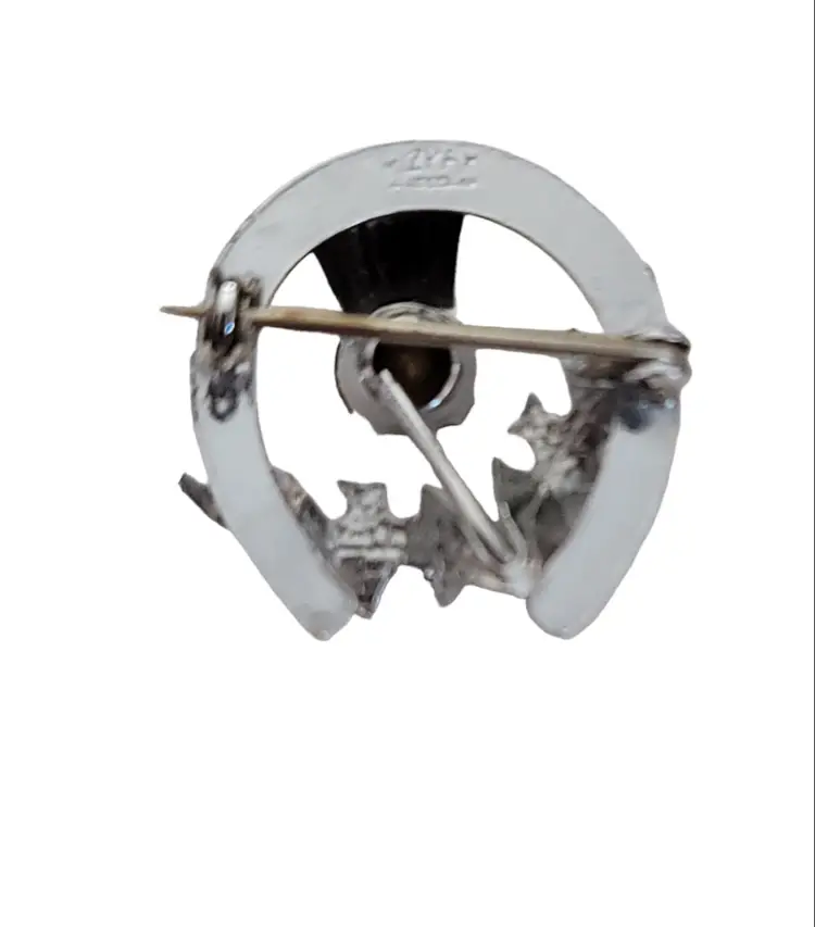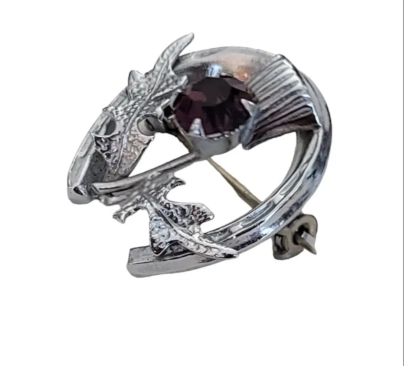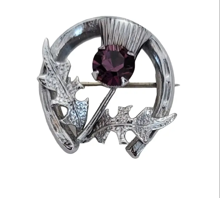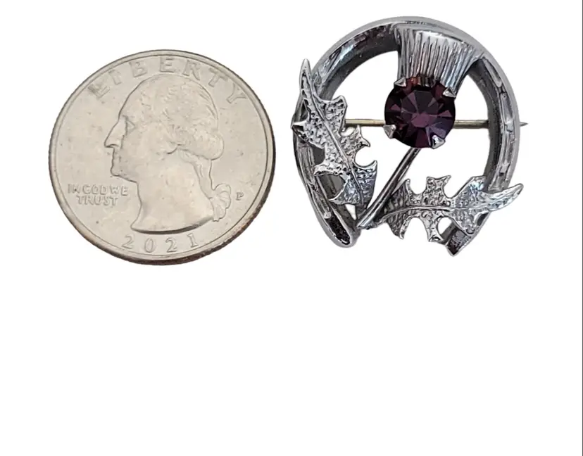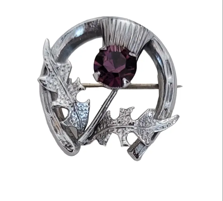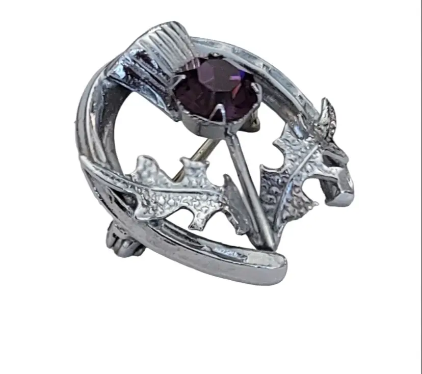 This Mizpah Silver Tone Scottish Thistle Horseshoe Leaf Pin is a pretty piece that will make a great addition to your collection. It measures approximately 0.9 inches in width and 0.9 inches in length. It features a silver-tone design with intricate detailing of a thistle, horseshoe, and leaf. The centerpiece of the pin is a vibrant purple rhinestone, adding a pop of color and sparkle. The back is marked Mizpah with a strong locking pin ensuring that it stays securely attached to your clothing or accessory throughout the day.