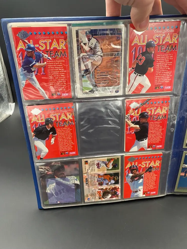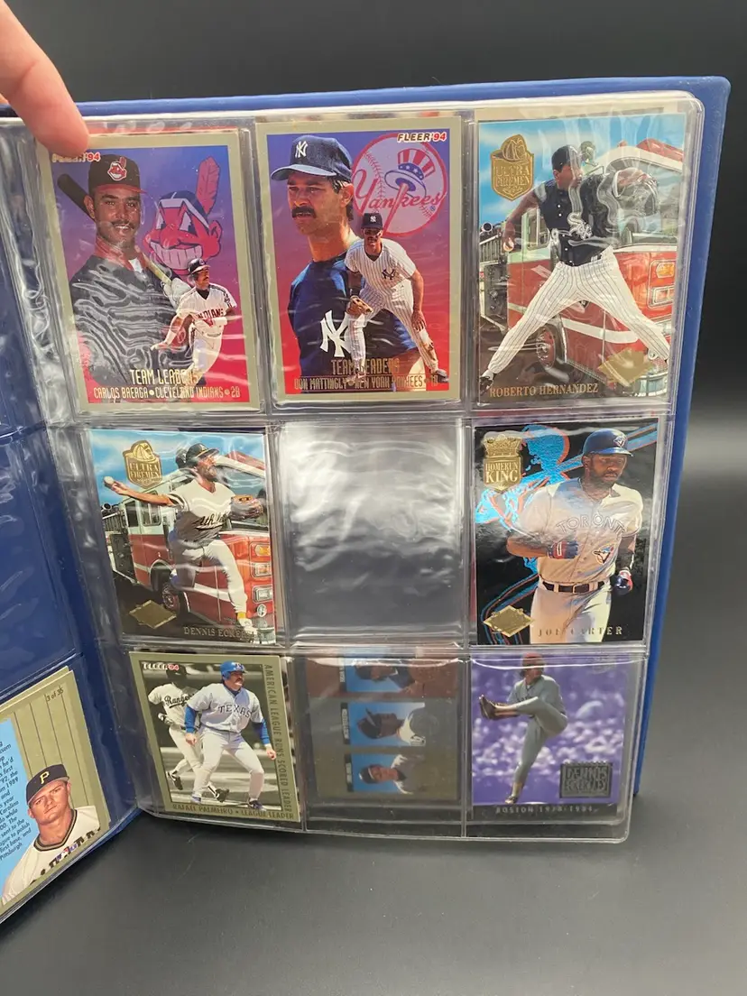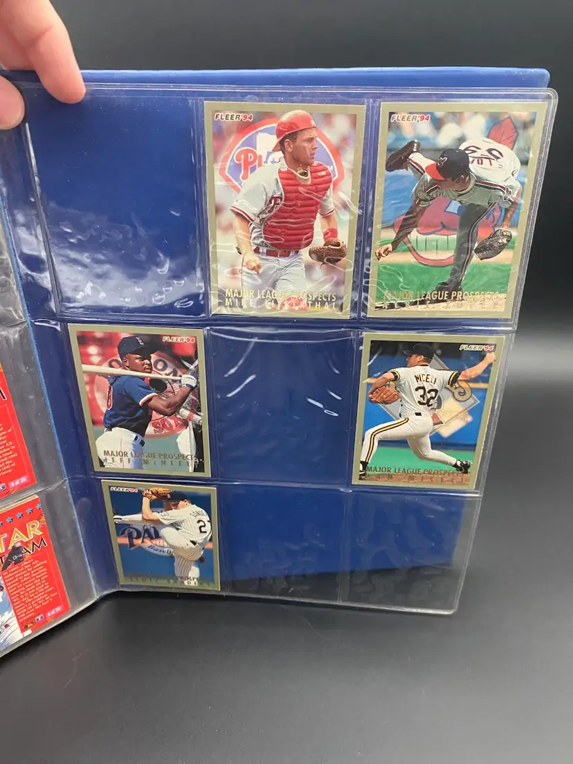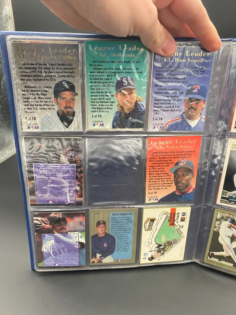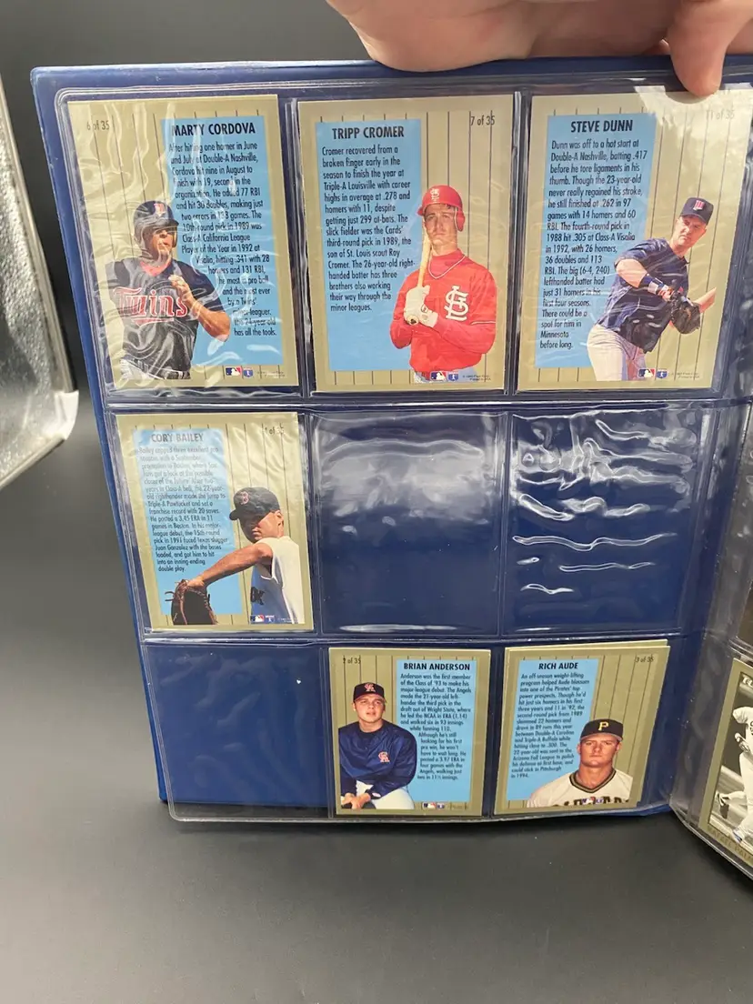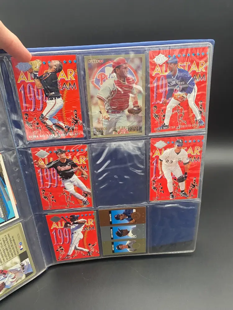 You are purchasing an Album of 36 Different MLB Insert Trading Cards. Look through the photos to see all of the Cards that are included in this listing, mostly from 1993-1994 Fleer and Fleer Ultra lines, with 4 Cards from the 1994 Topps Black Gold line. These Cards are in Excellent to Near Mint Condition. Album Book has some wear, including a split in the bottom exterior spine.