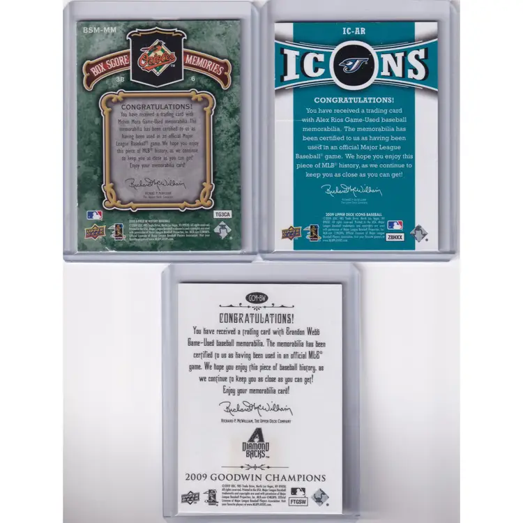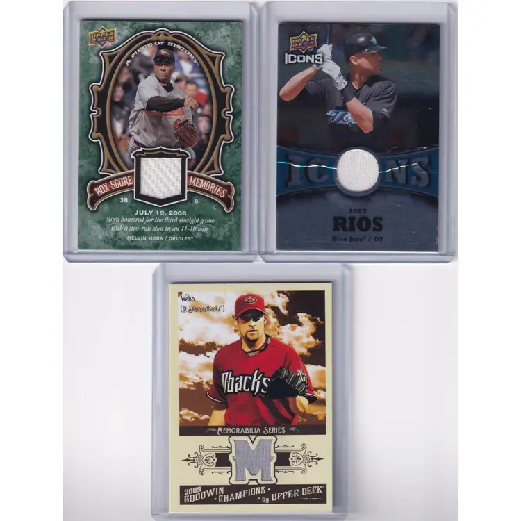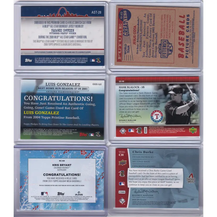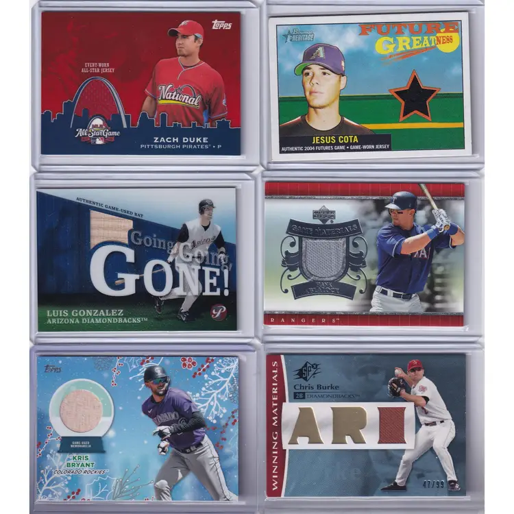 08 UD SPX Chris Burke 47/99 07 UD Hank Blalock 05 Bowman Heritage Jesus Cota 23 Topps Holiday Kris Bryant 04 Topps Luis Gonzalez 09 Topps Zach Duke 09 UD Icons Alex Rios (Damaged across the middle) 09 UD GC Brandon Webb 09 UD Melvin Mora
