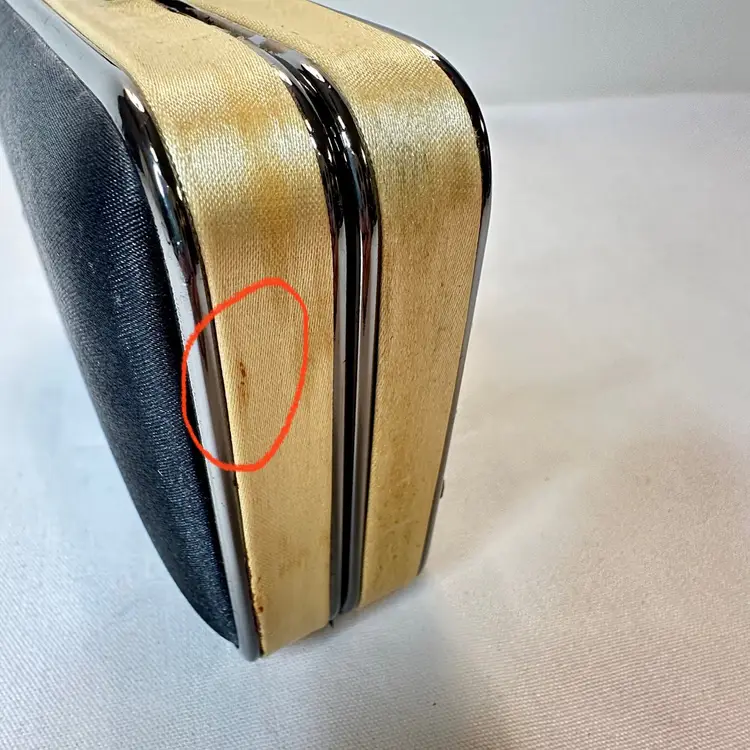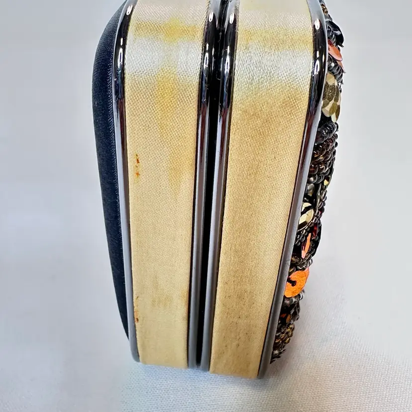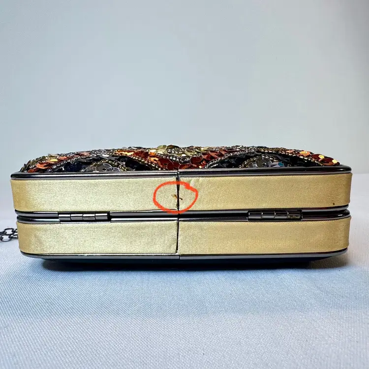 It is in excellent condition. There are a couple of tiny “stains” I believe to be from the hardware itself. Please view the photos for details. It comes with a detachable metal chain strap that measures 48” to make it a convenient crossover style clutch.