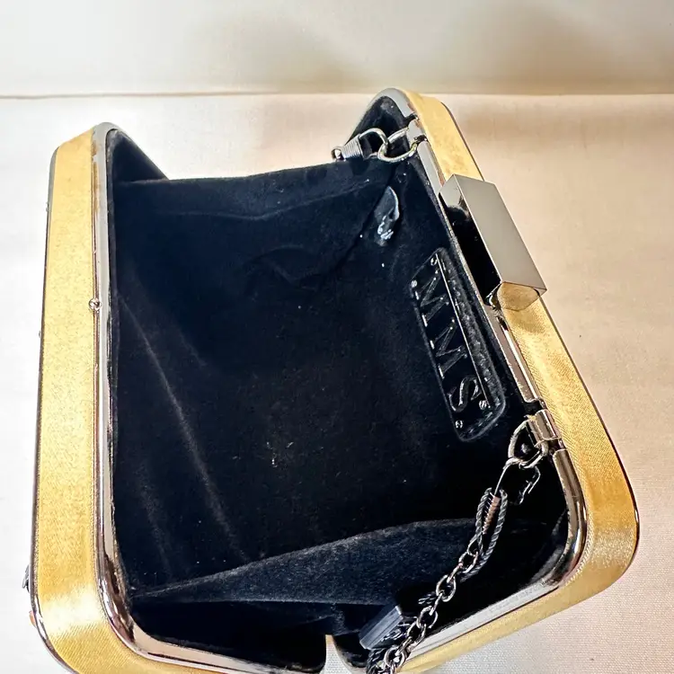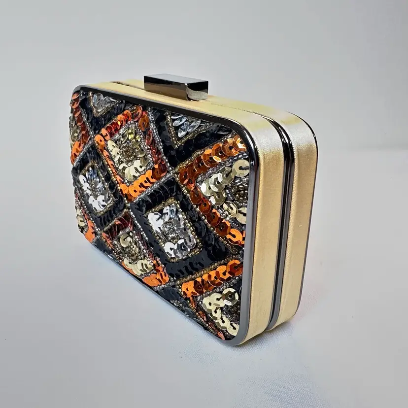 This listing is for this elegant Harlequin Geometric Metallic Sequin Clutch by MMS Design Studio. It is new with tags. It is a stylish and elegant evening bag perfect for formal occasions like weddings and cocktail parties. This small rectangular clutch features a geometric pattern with metallic sequin accents, giving it a retro and sophisticated charm. The gunmetal hardware and detachable chain strap add a touch of glamour to the black, bronze, silver, and gold exterior. The satin fabric and velvet lining ensure luxury and quality in this chic clutch from M&M's.