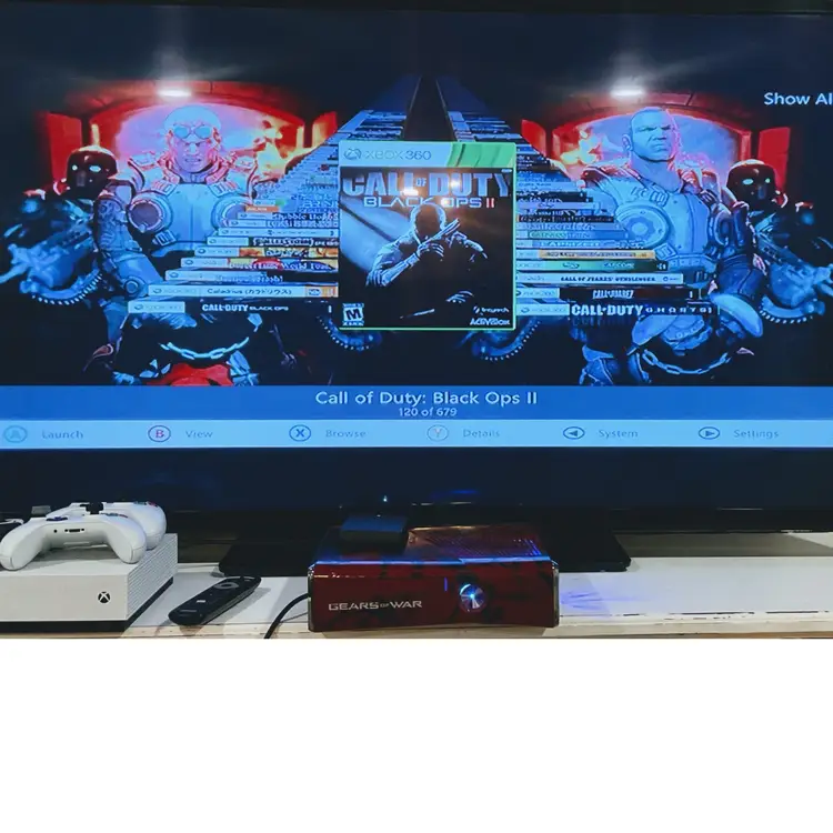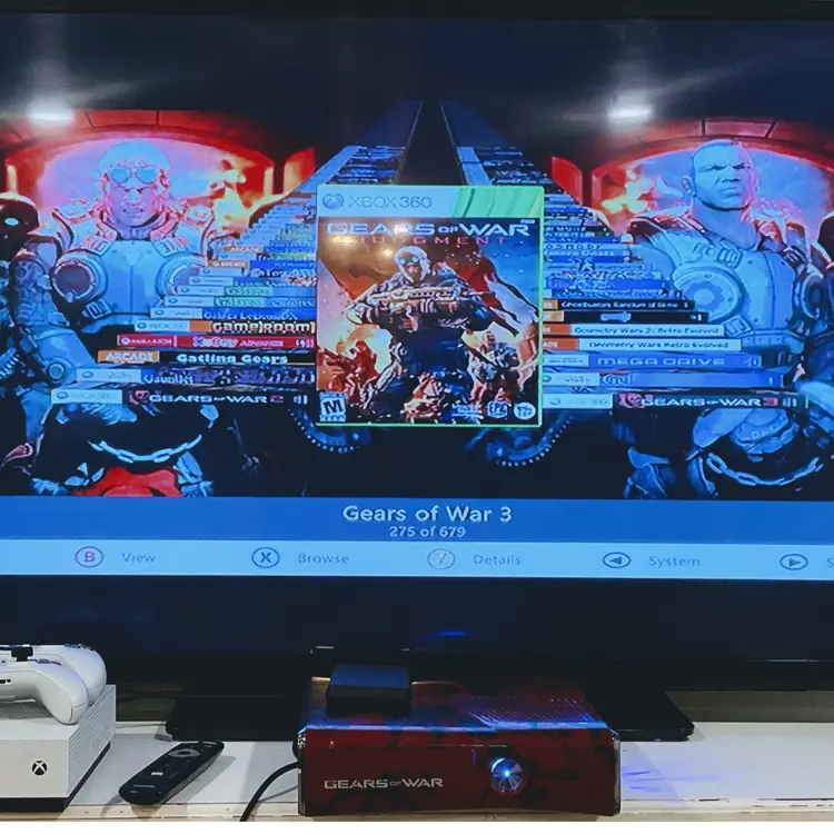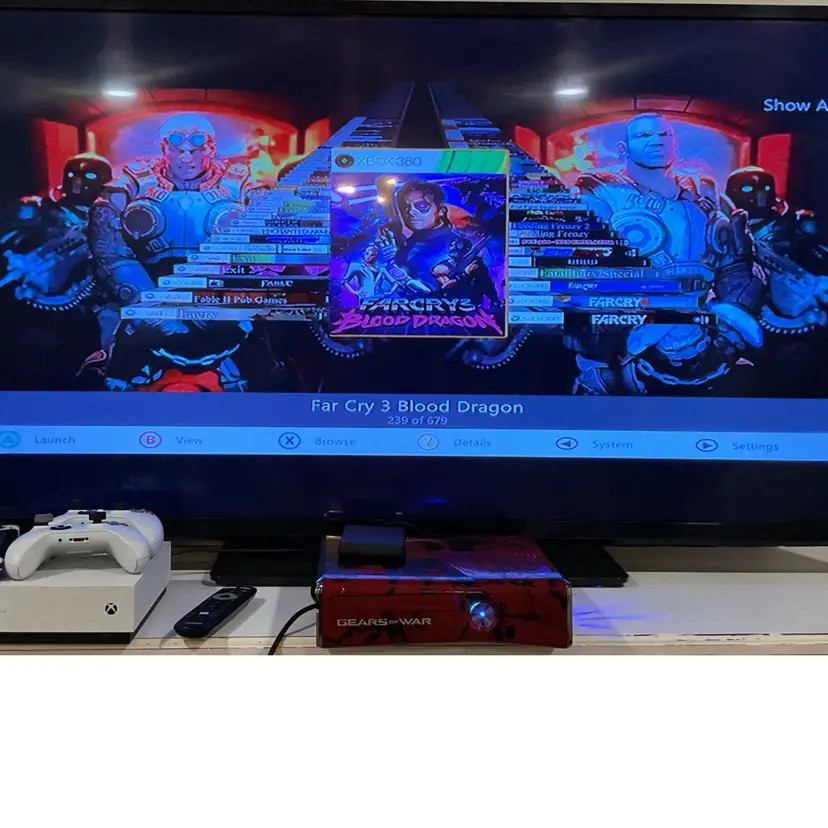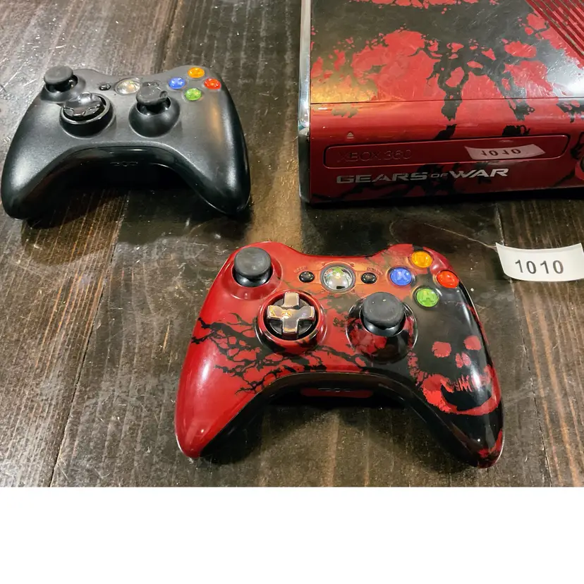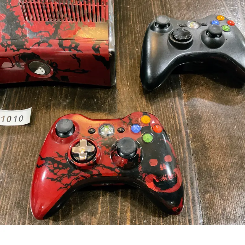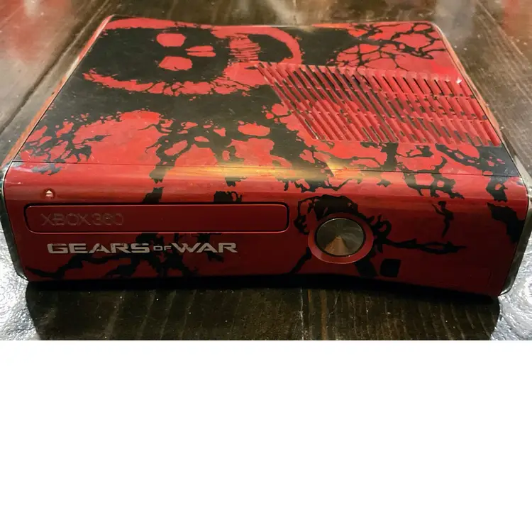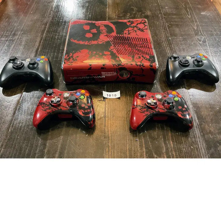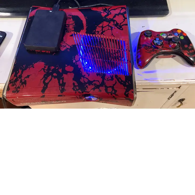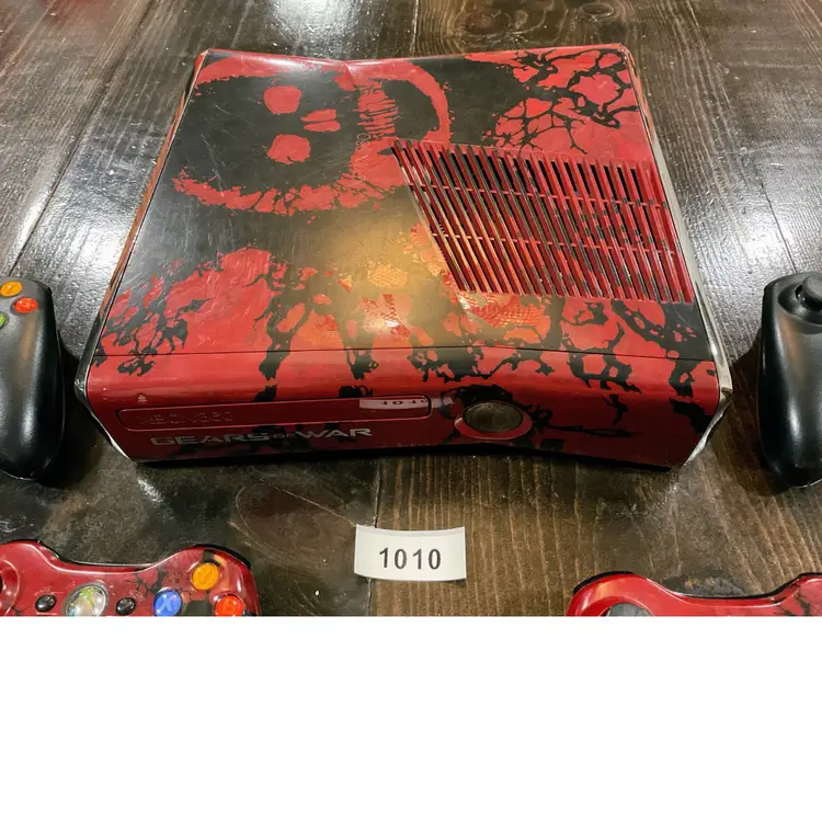 Up for sale my personal Gears of War Xbox 360, modded with 600 + Xbox 360 games, Xbox live games and Emulators. The Xbox is modded with Aurora and comes with a 1 terabyte hard drive to hold all the games everything I played worked with no issues. The Xbox also includes 4 controllers 2 Gears of war controllers and 2 standard black controllers. The condition of the Xbox is good there are some scratches on the shell and the controllers show wear from use on the sticks and pad please refer to the pictures, the fan is a little loud but everything works as it should. If you have any questions you can message me. I will have more modded systems and games to be posted soon thanks.
