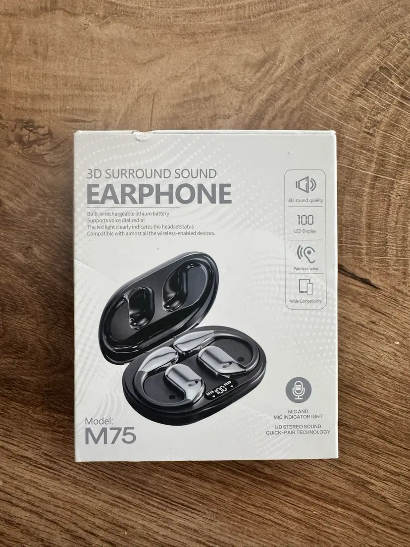 Experience powerful, crystal-clear sound anywhere with the Model M75 3D Bluetooth Surround Sound Earbuds. Designed for comfort, performance, and mobility, these wireless earphones deliver immersive 3D surround sound with a secure ear-hook fit perfect for workouts, travel, or everyday use.