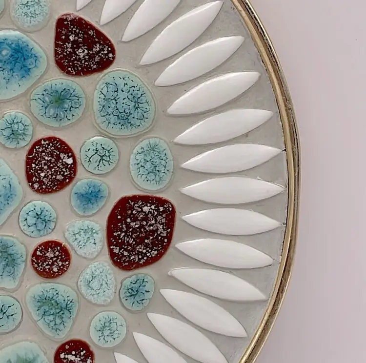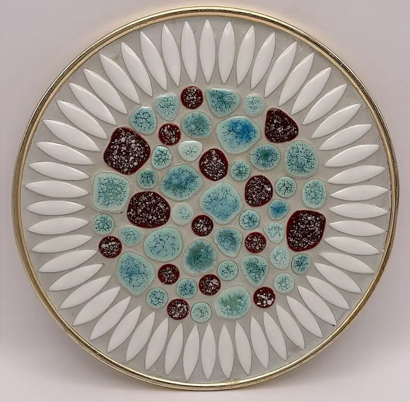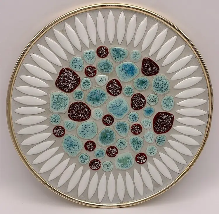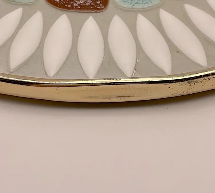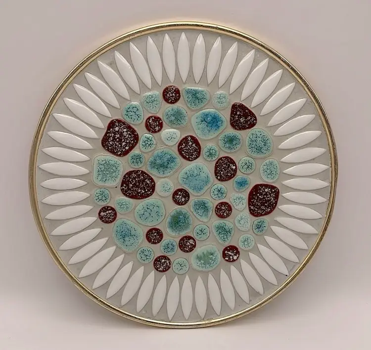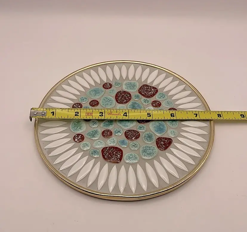 Modern Art Mosaic MCM Trivet, Bright Gold Plate with Beautiful Glass Inlay, Turquoise, White and Reddish Brown, 7.5” (Some wear, as shown, due to age)