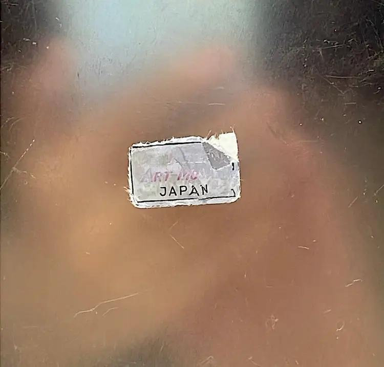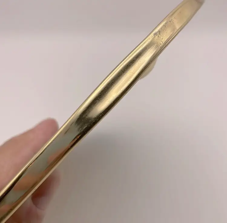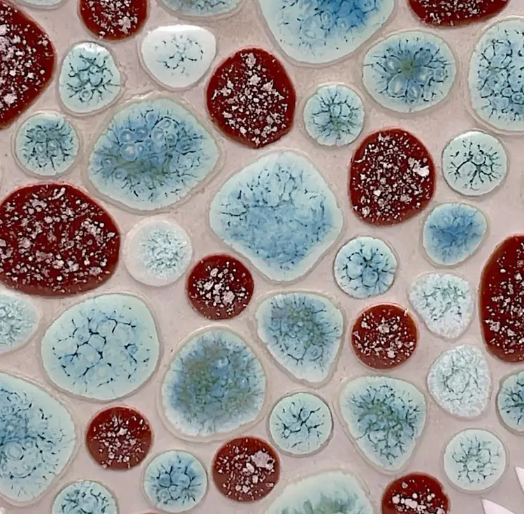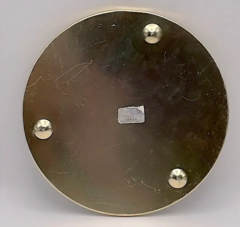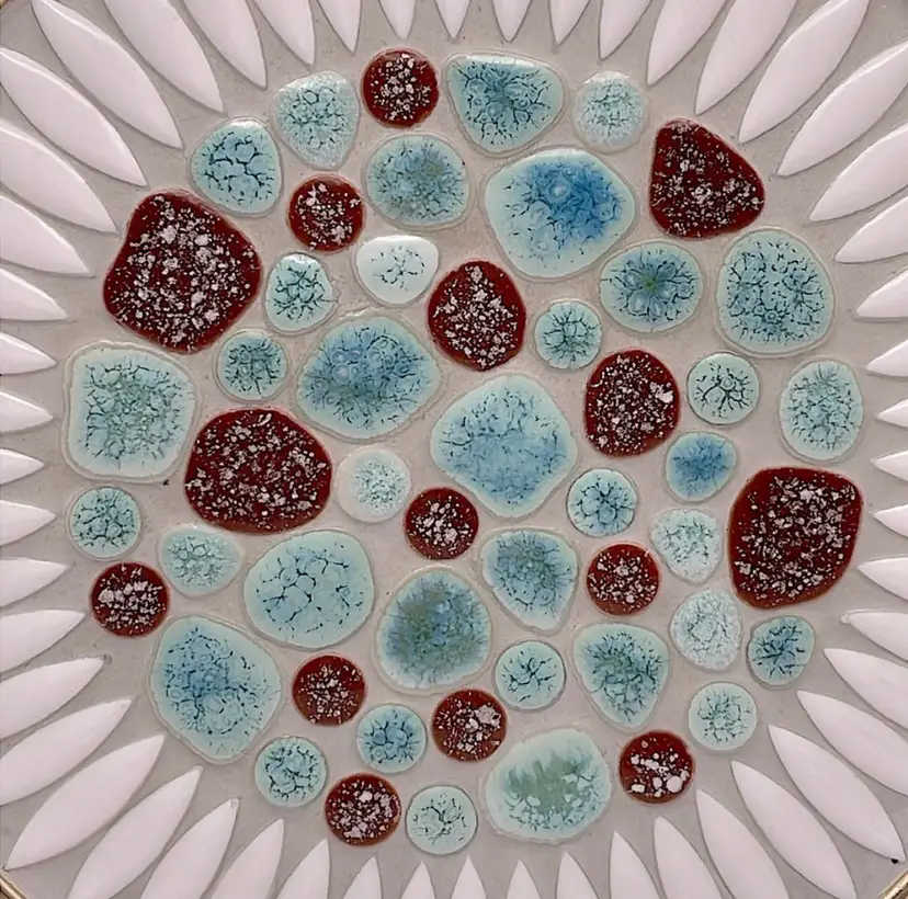 Modern Art Mosaic MCM Trivet, Bright Gold Plate with Beautiful Glass Inlay, Turquoise, White and Reddish Brown, 7.5” (Some wear, as shown, due to age)