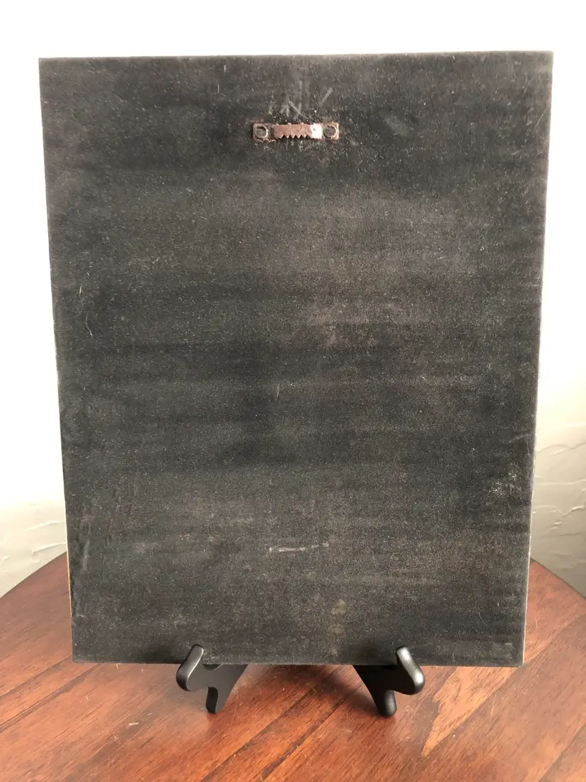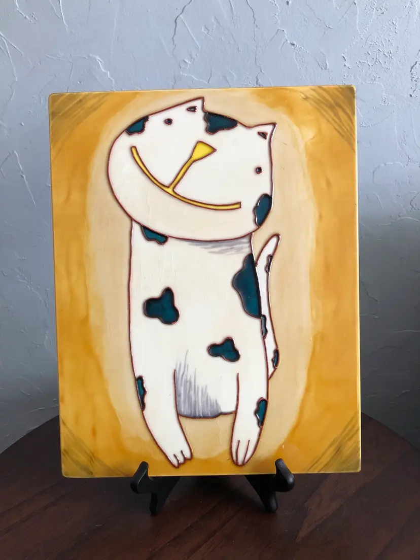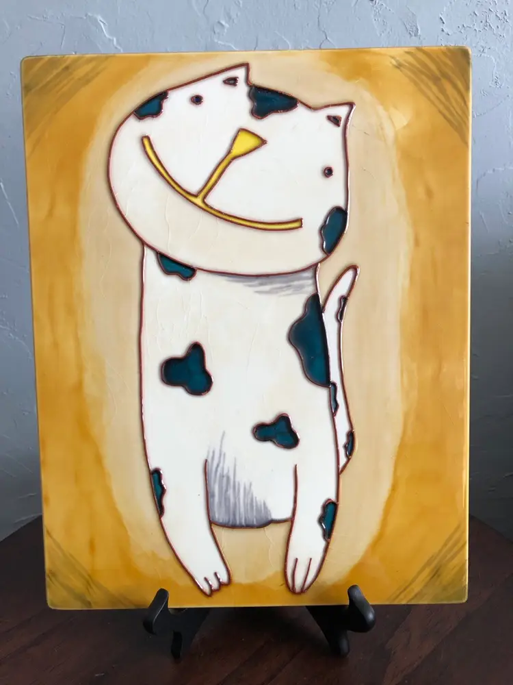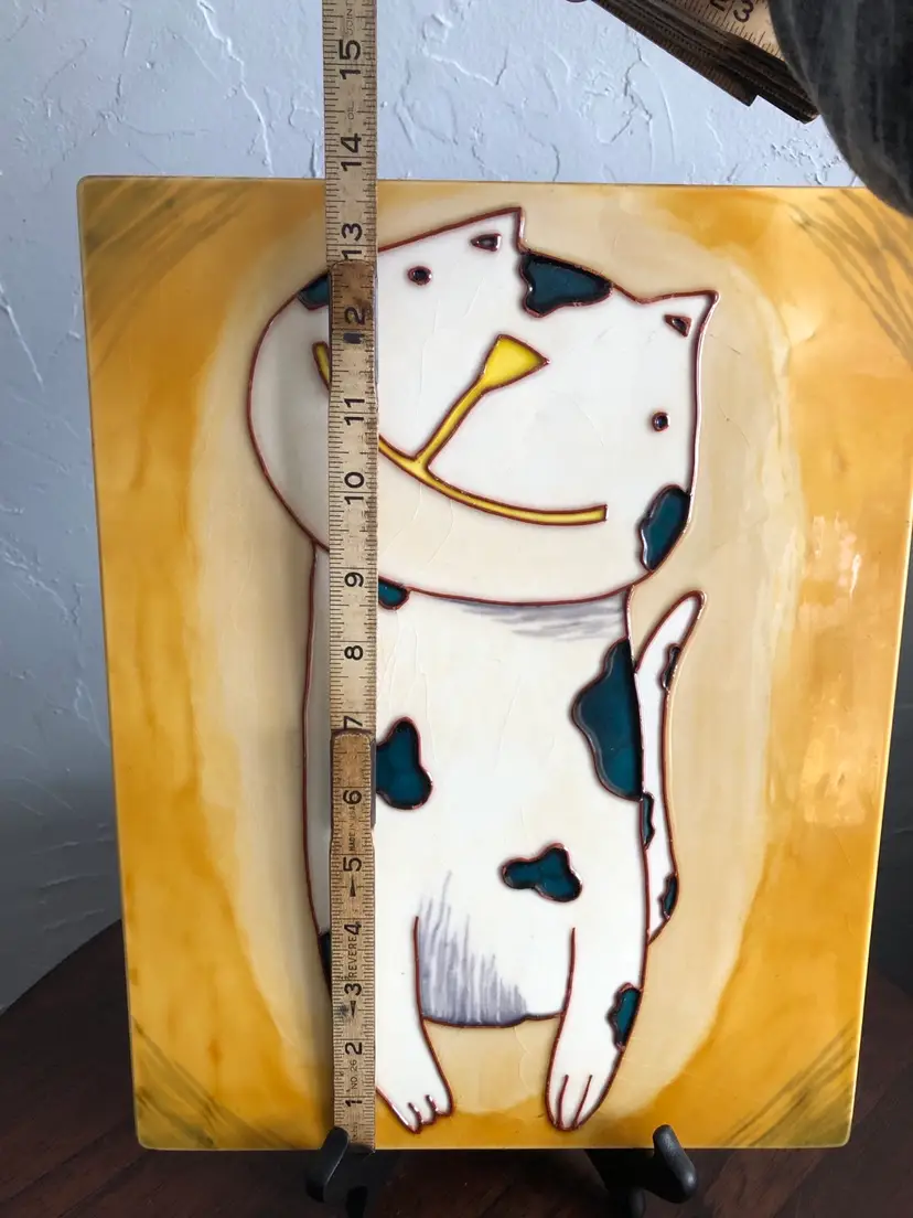 This is a cute cat wall art piece. Bright, happy colors and simple design. Some crazing in heavy acrylic, see pictures. Chips or breaks. Has a hook to hang in the wall. It is about 14” x 11”.