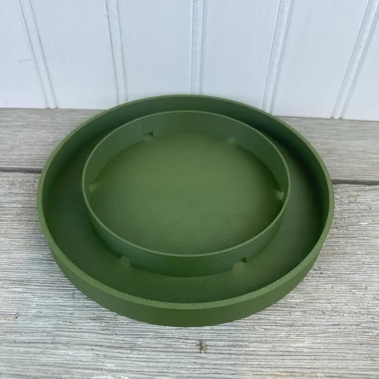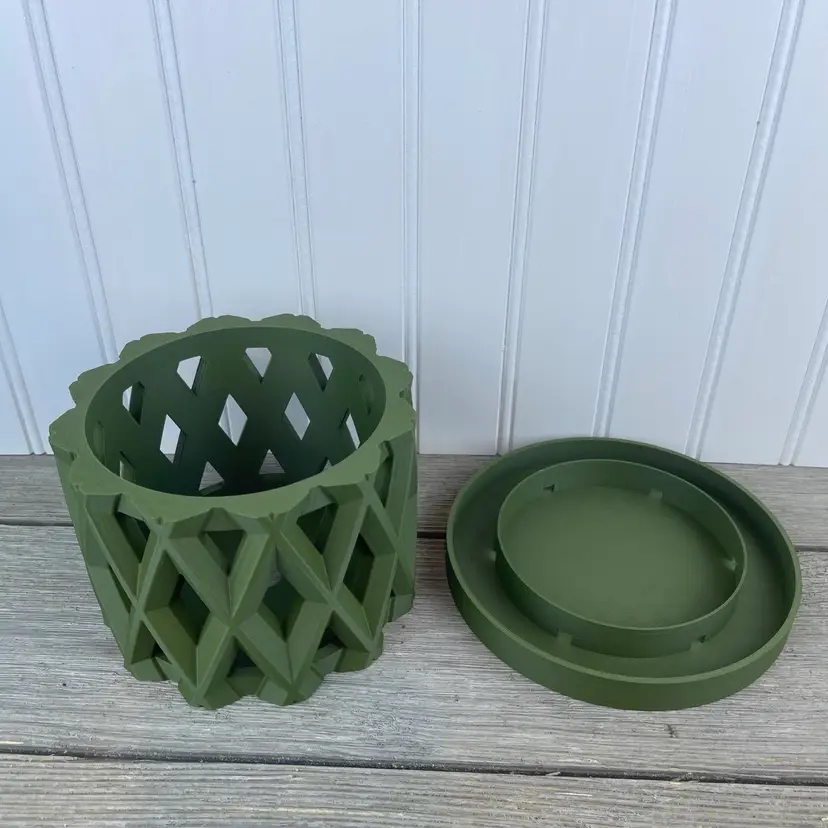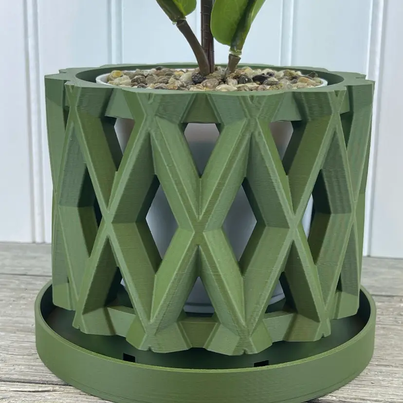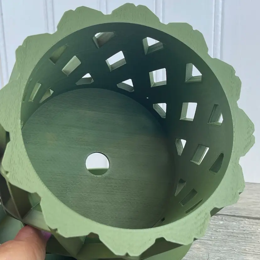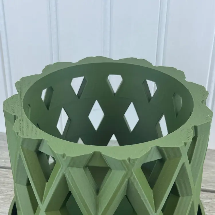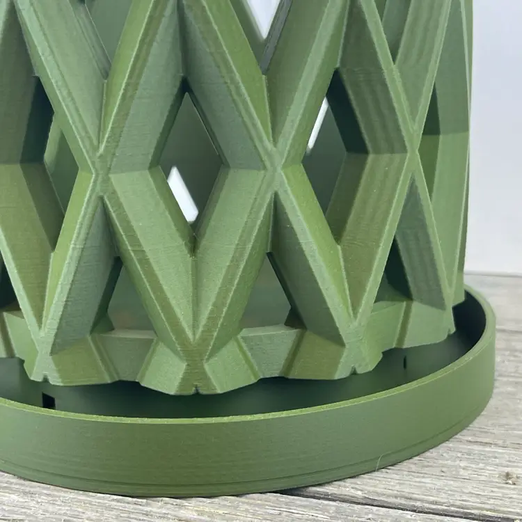 The planter is 3D printed using eco-friendly, biodegradable PLA plastic filament. 3D printing is done by printing layer upon layer of filament to build up and create the print.