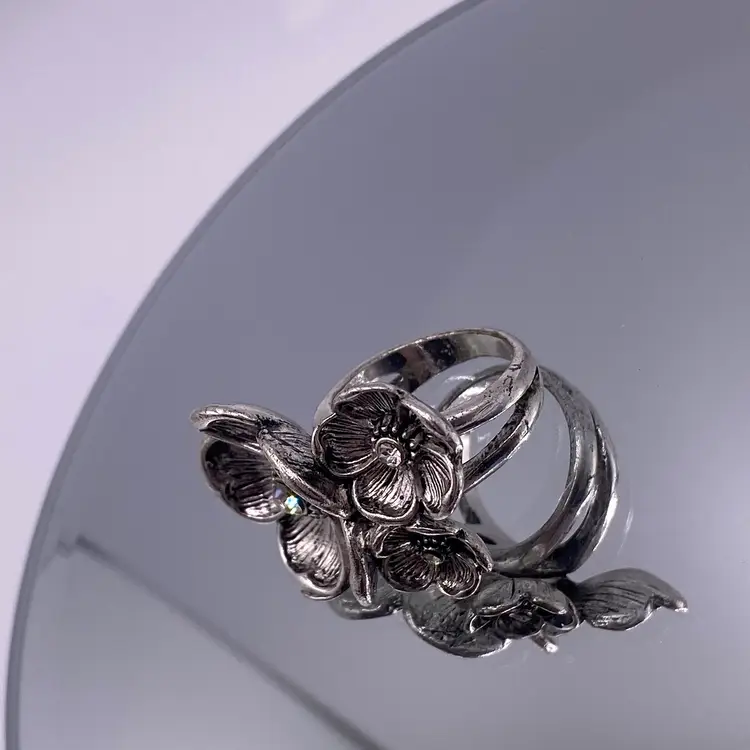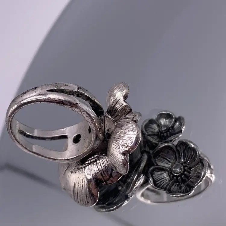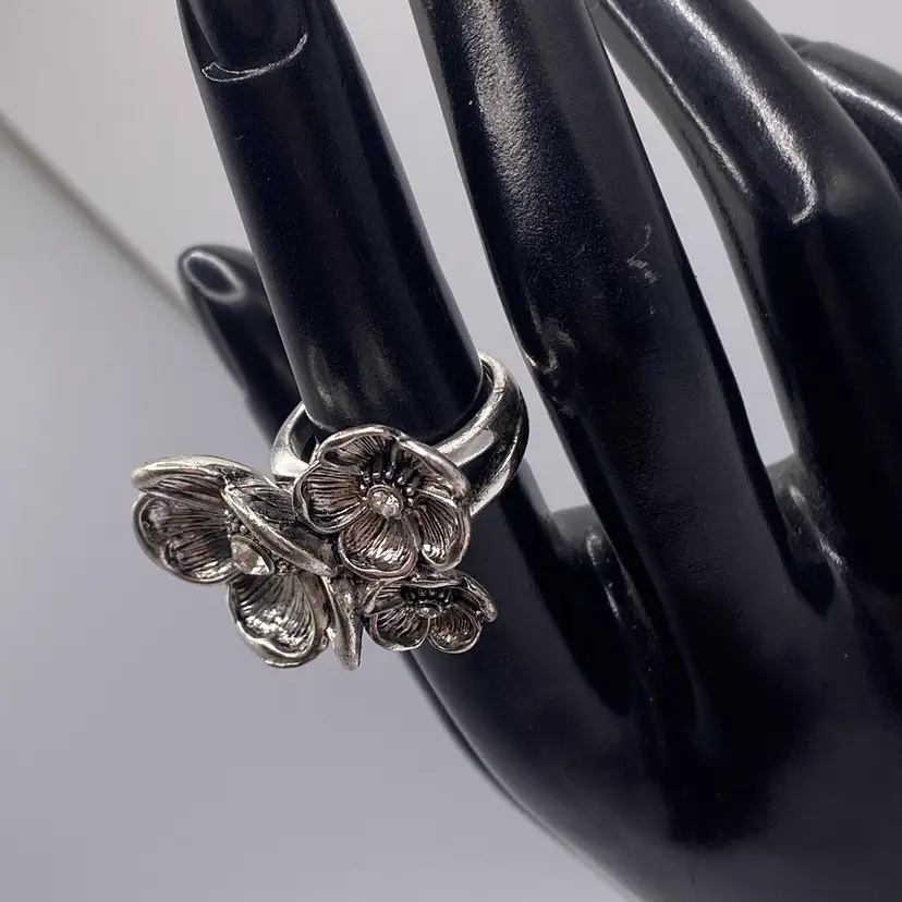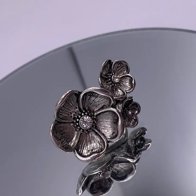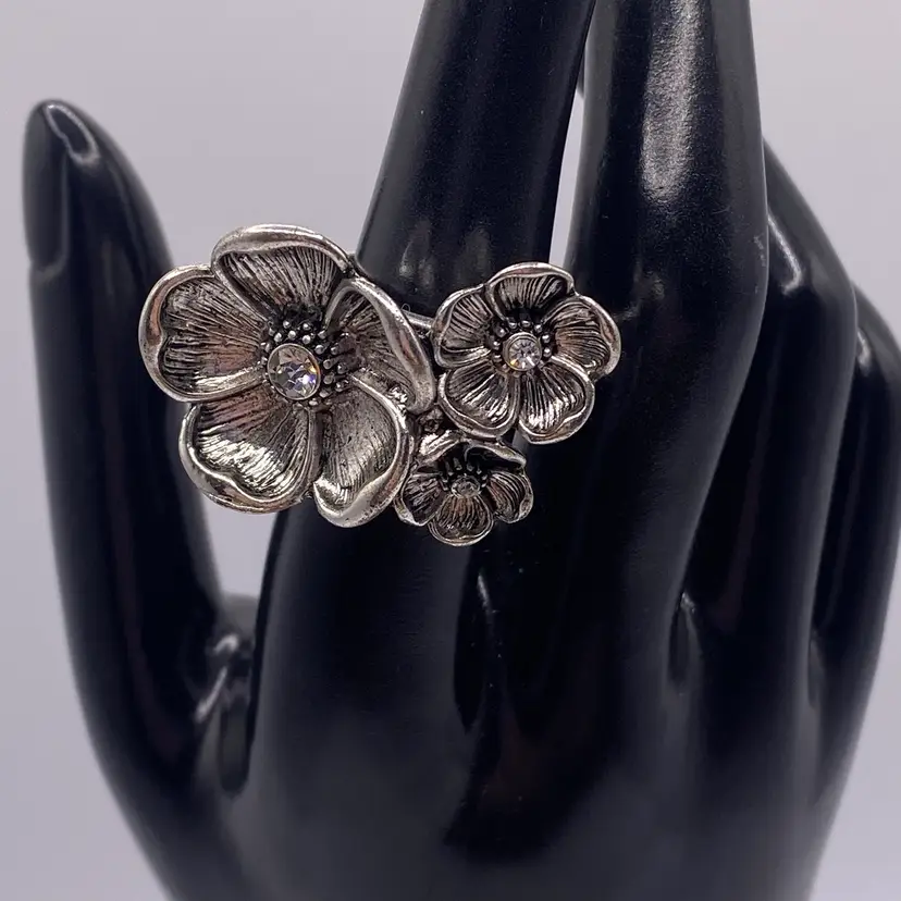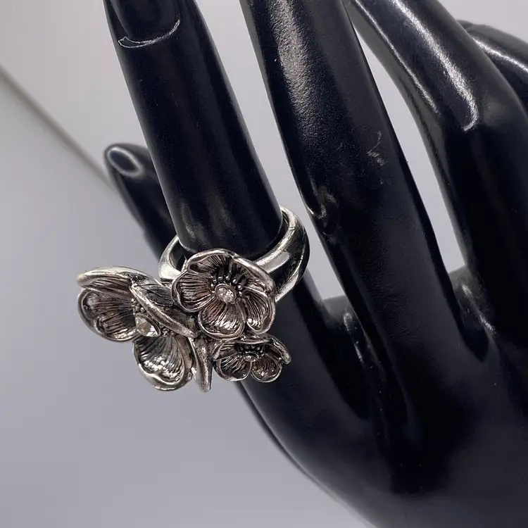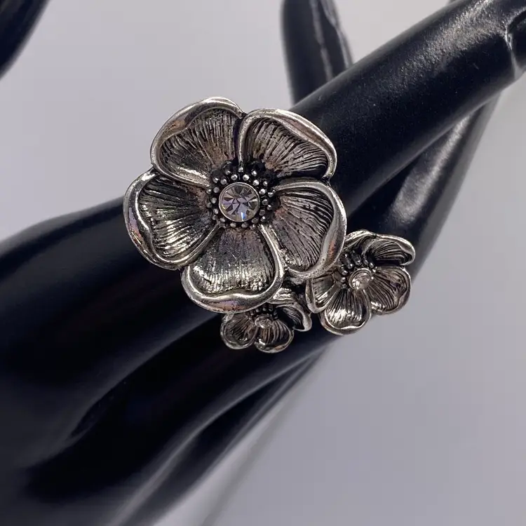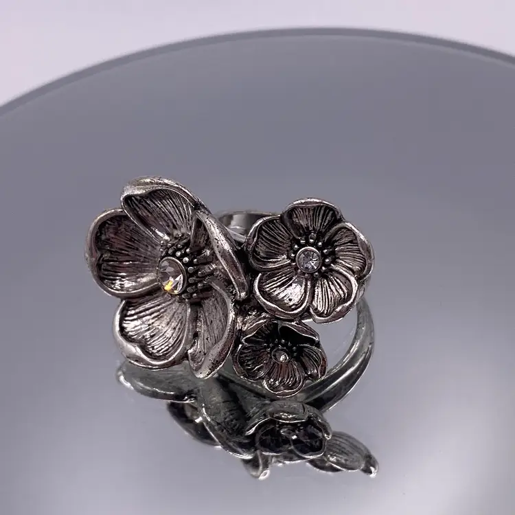 This modern silver tone band ring features a beautiful floral cluster design with sparkling crystal rhinestones. The ring is perfect for any occasion and adds a touch of beauty to any outfit. The band is made of durable stainless steel with a width of 3 mm and a ring size of 6.5.