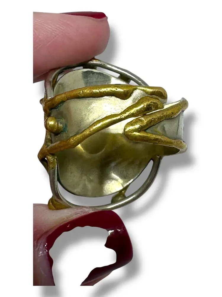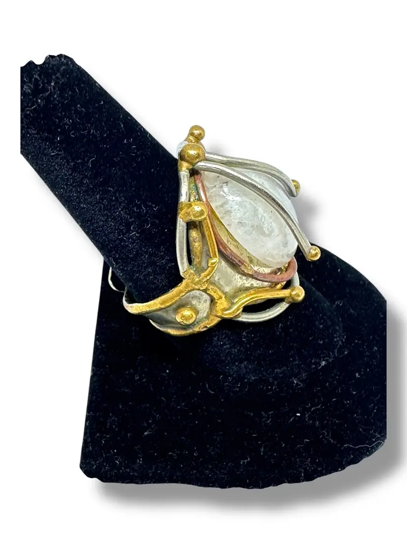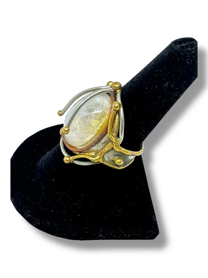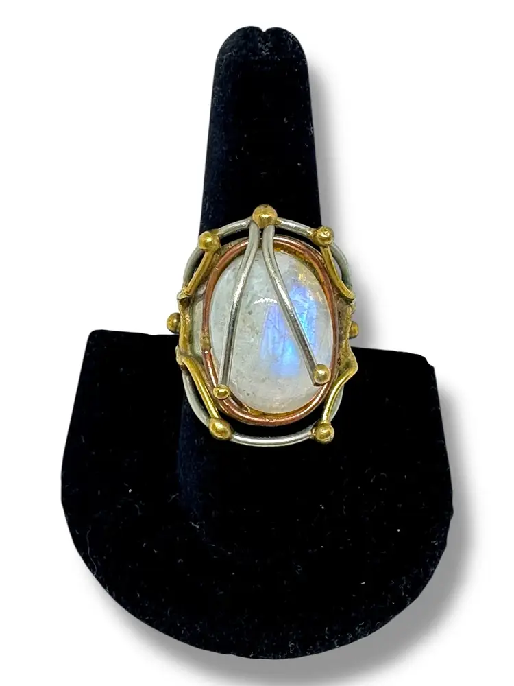 Modernist Mixed Metal Design Beetle Bug Moonstone Ring. Size 9. Cabazon moonstone with beautiful blue glow.