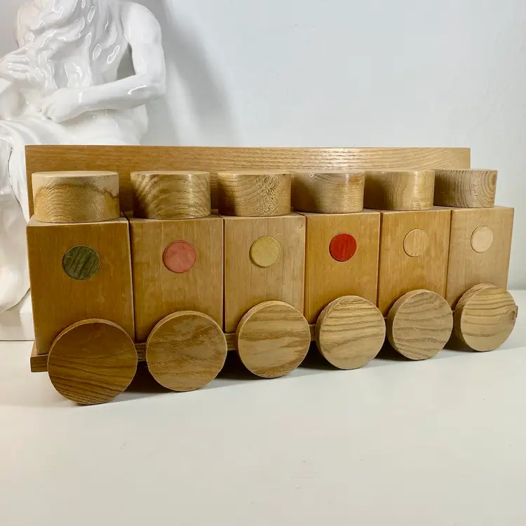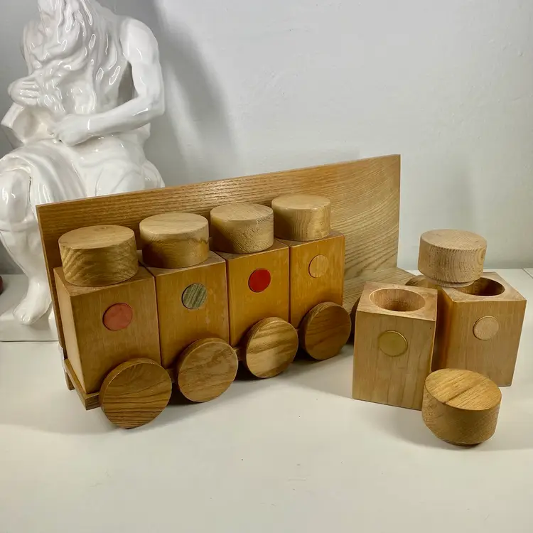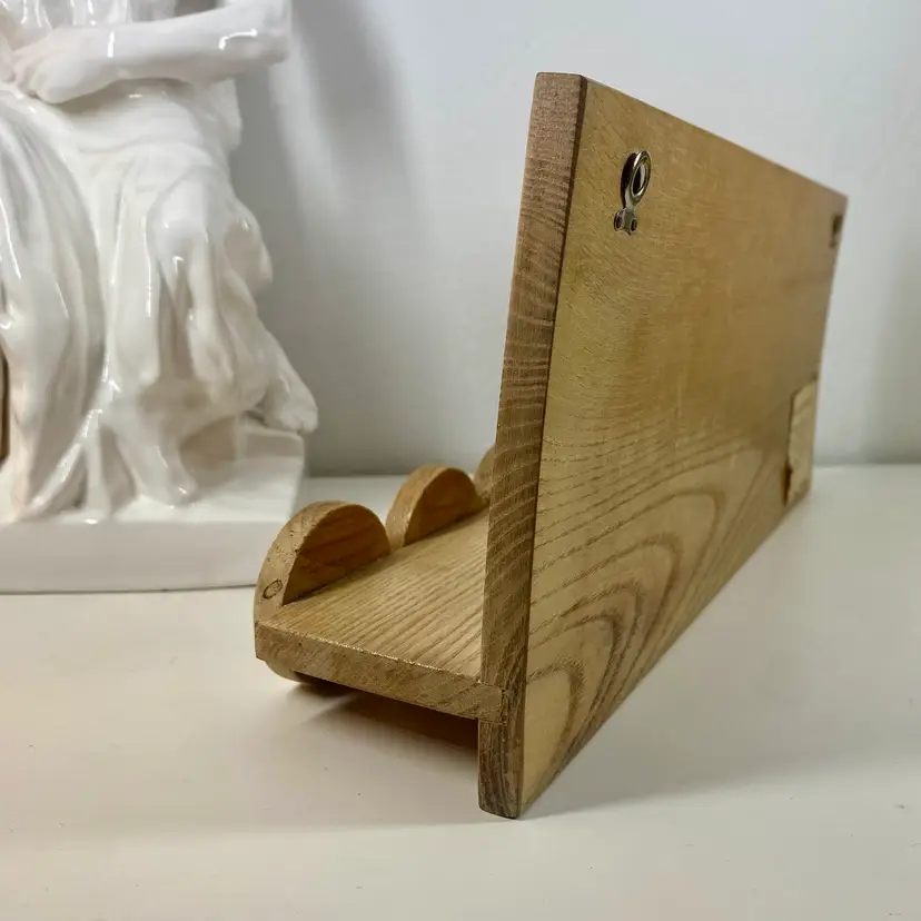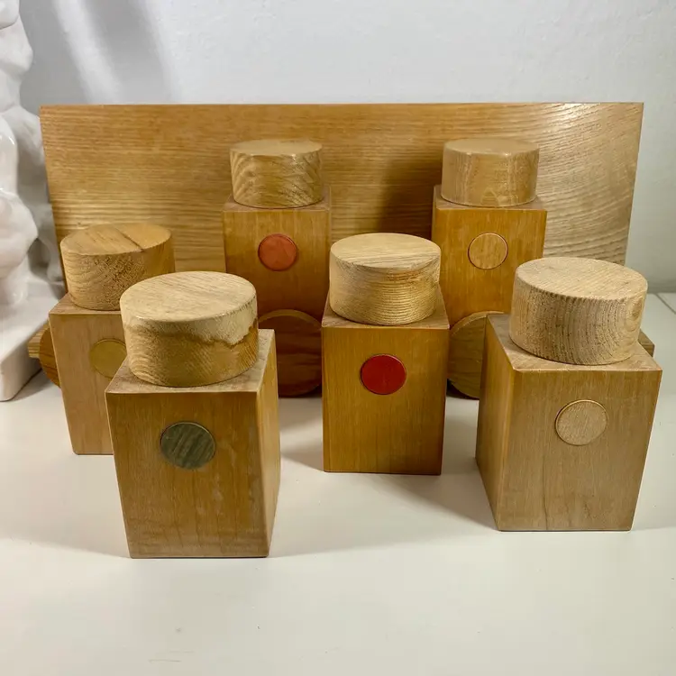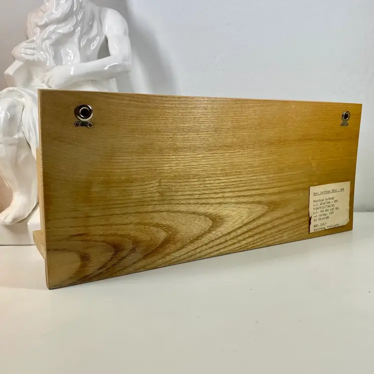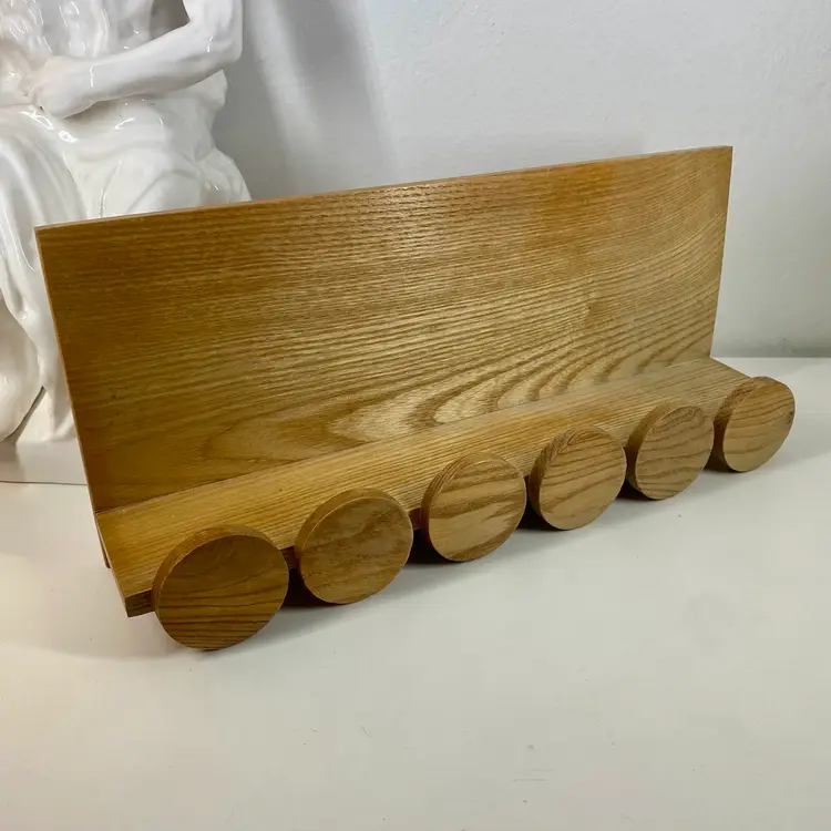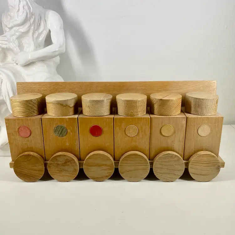 Hi... This vintage spice rack from Moravska Urstredna Brno is a perfect addition to any modernist kitchen or collection. With six wooden bottles and its compact size, it is ideal for storing spices and other kitchen essentials. The rack is made of natural wood and features a minimalist, simplistic design that is reminiscent of the Bauhaus style. Founded in 1909 as an artist cooperative and still in business as a toy producer, this spice rack design was originally introduced 1933 as part of a complete wooden kitchen line incorporating the Bauhaus design principals. This piece dates to 1972, and comes with its original six bottles and a shelf, which can be easily wall mounted. Whether you are a collector or just looking for a functional and unusually stylish spice rack, this Moravska Urstredna Brno spice rack is an excellent choice. Overall measurements: 13.5"x 3.5" 6" in height.