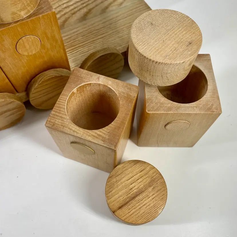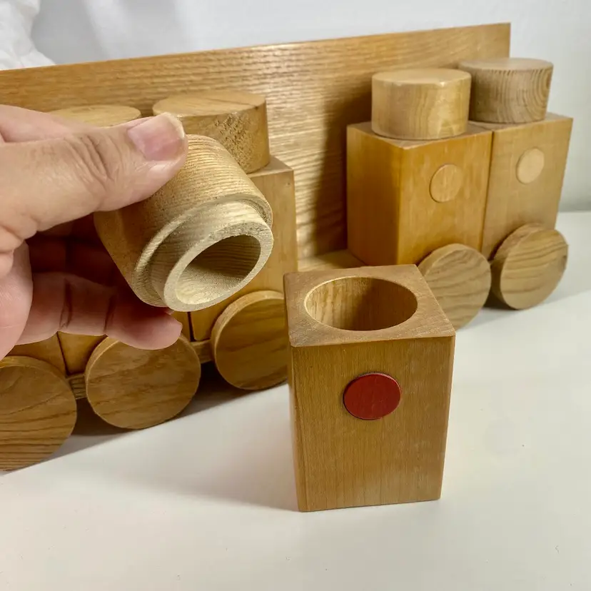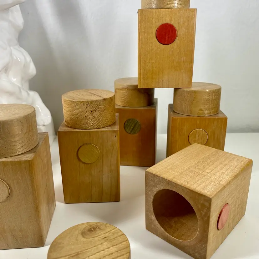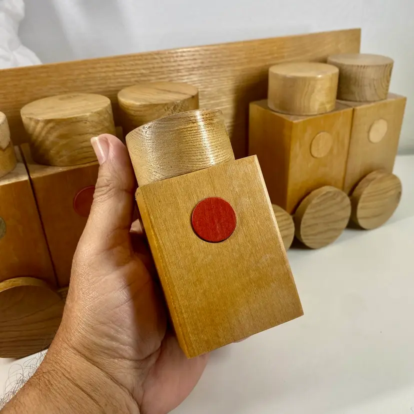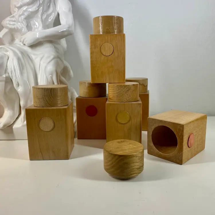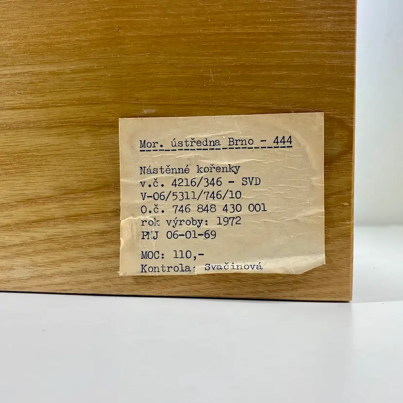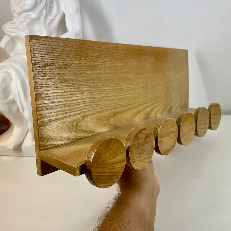 Hi... This vintage spice rack from Moravska Urstredna Brno is a perfect addition to any modernist kitchen or collection. With six wooden bottles and its compact size, it is ideal for storing spices and other kitchen essentials. The rack is made of natural wood and features a minimalist, simplistic design that is reminiscent of the Bauhaus style. Founded in 1909 as an artist cooperative and still in business as a toy producer, this spice rack design was originally introduced 1933 as part of a complete wooden kitchen line incorporating the Bauhaus design principals. This piece dates to 1972, and comes with its original six bottles and a shelf, which can be easily wall mounted. Whether you are a collector or just looking for a functional and unusually stylish spice rack, this Moravska Urstredna Brno spice rack is an excellent choice. Overall measurements: 13.5"x 3.5" 6" in height.