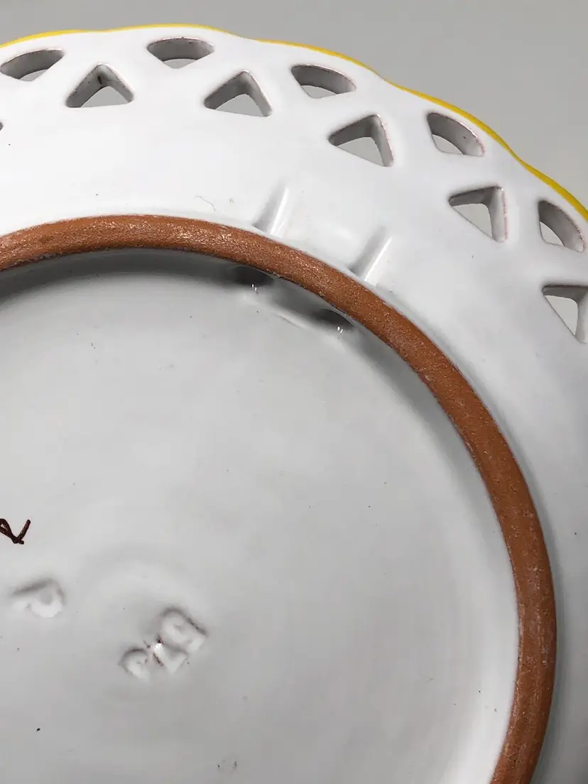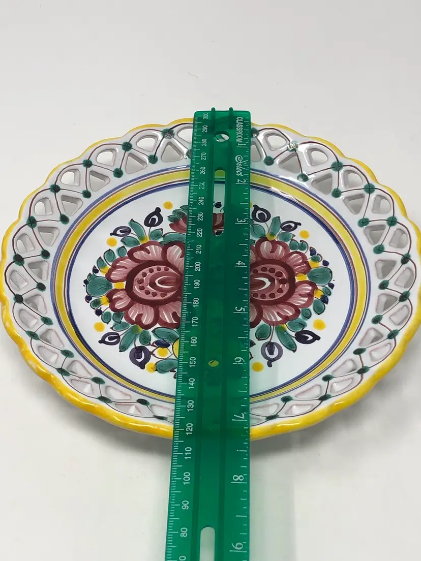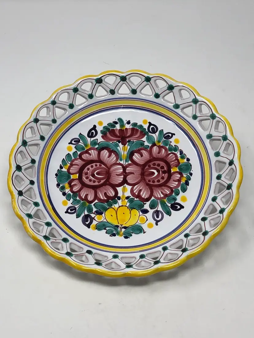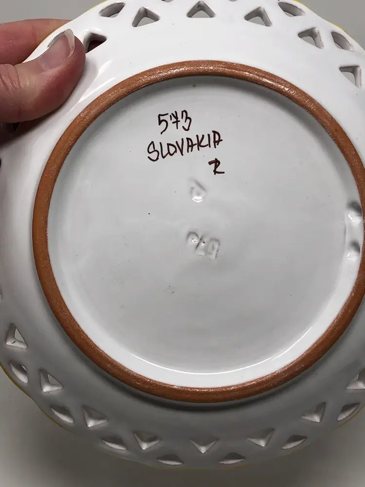 Beautiful floral design and intricate open design on the edges. 7" across, no chips or cracks. Marked Slovakia 573 on the back with holes for hanging