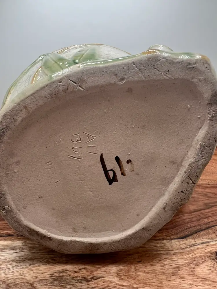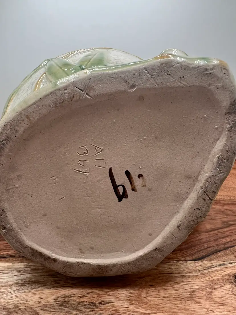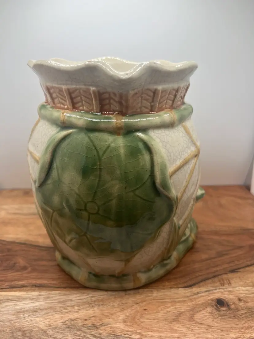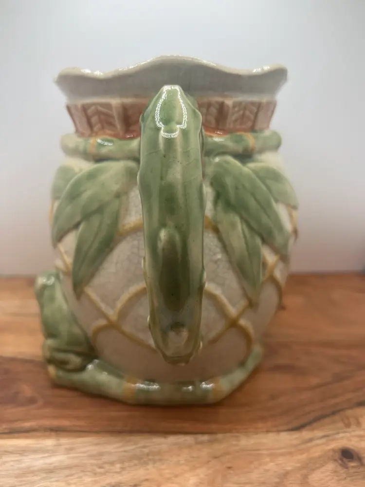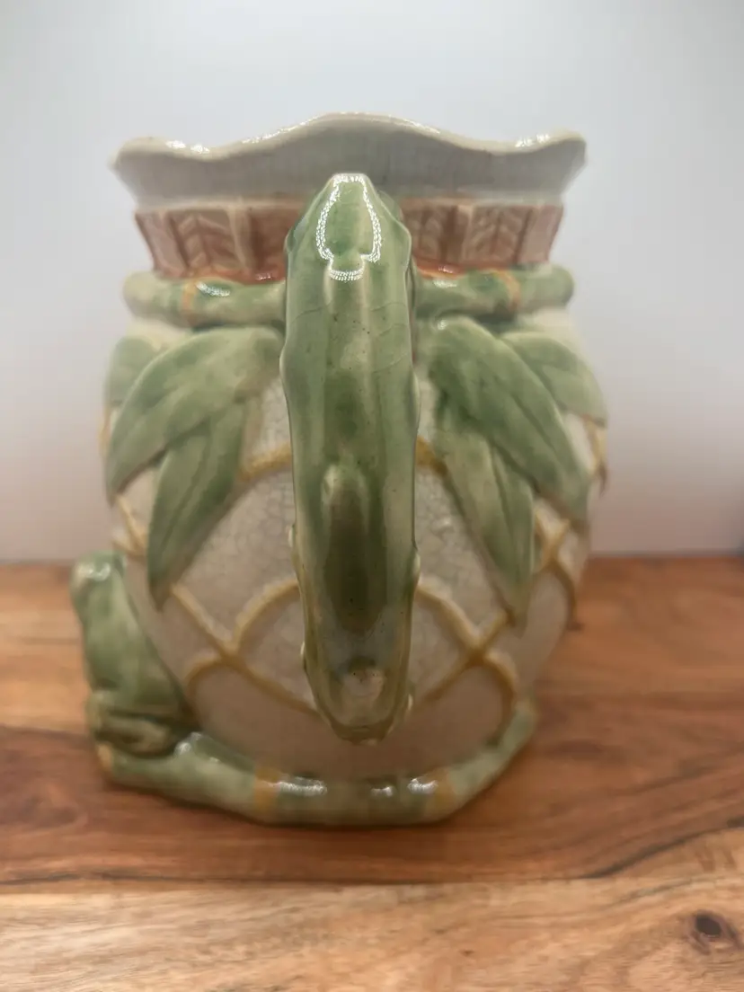 Mojolica pitcher with frog, lily pads, and bamboo accents. Beautiful pitcher/vase. Marked on bottom. Excellent used condition; no chips, cracks, or repairs.