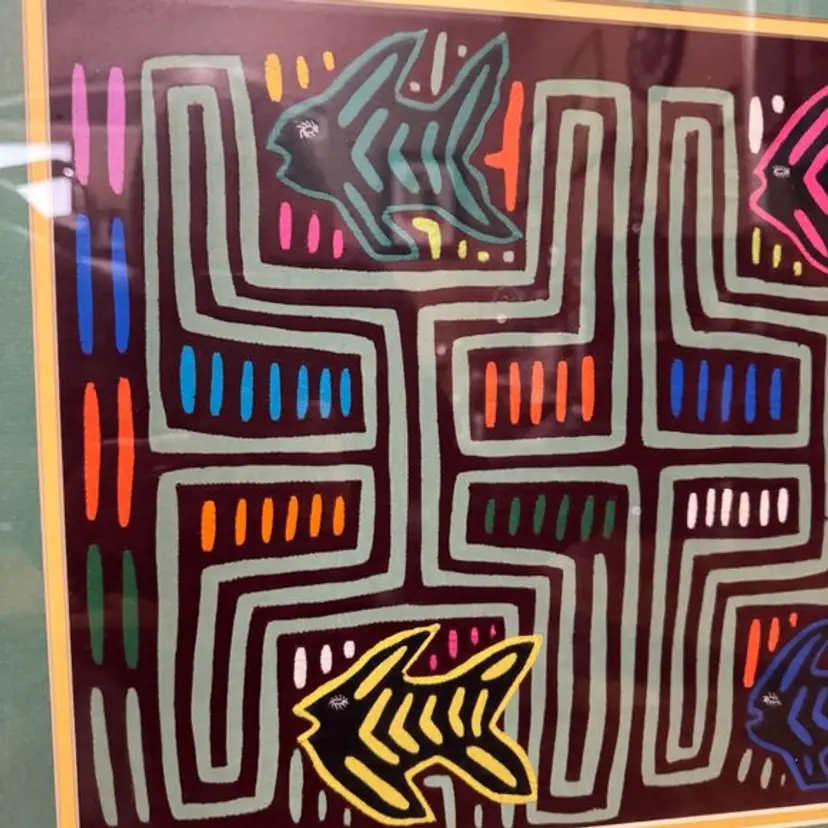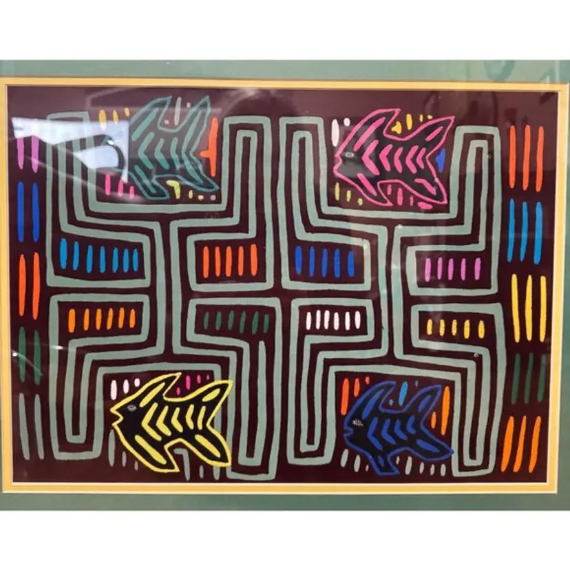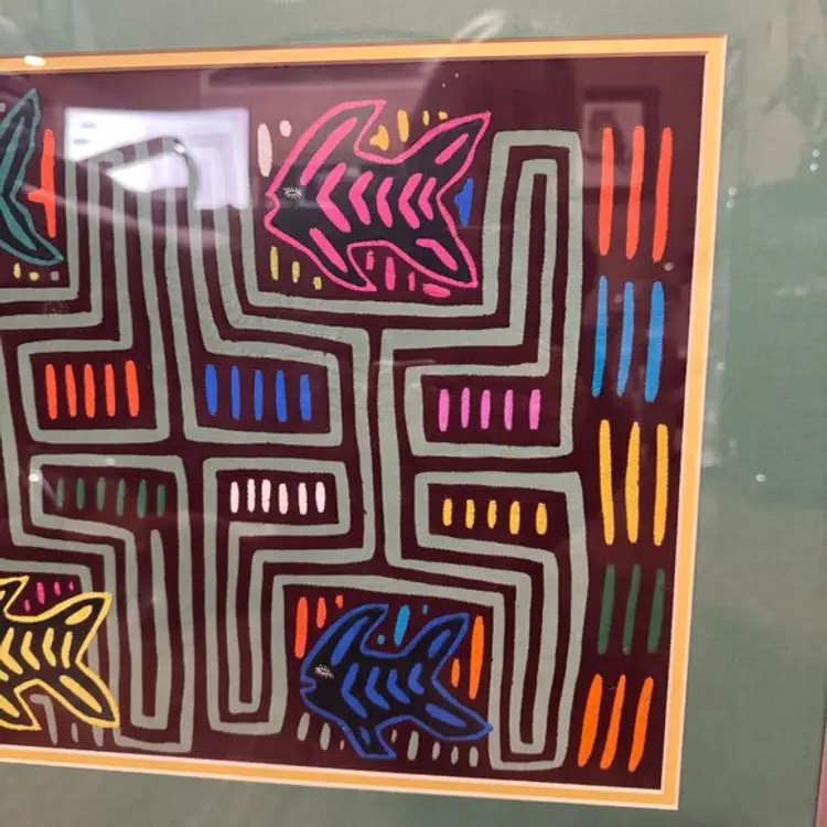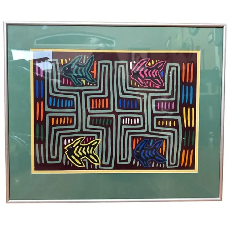 Mola Art of Angel Fish Turtles Reverse Applique Kuna Indians Panama Pro Framed