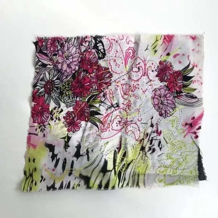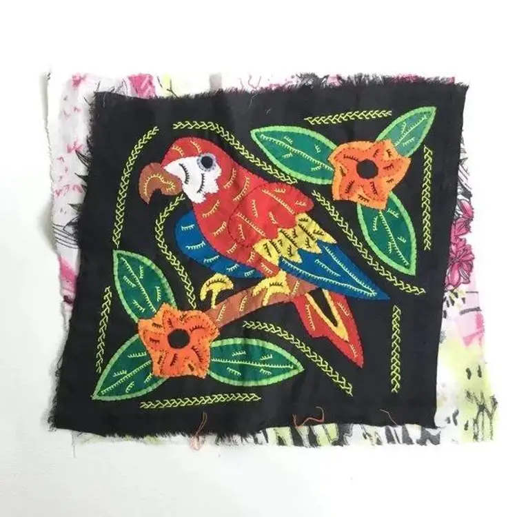 This mola features a design with a parrot standing on a branch with two orange flowers on the outside.