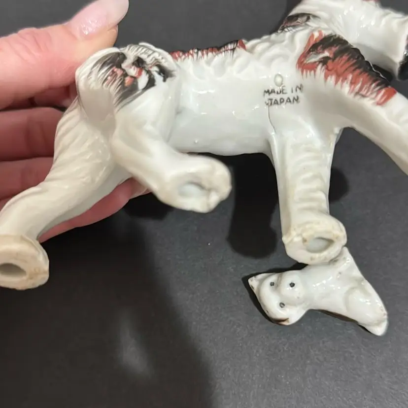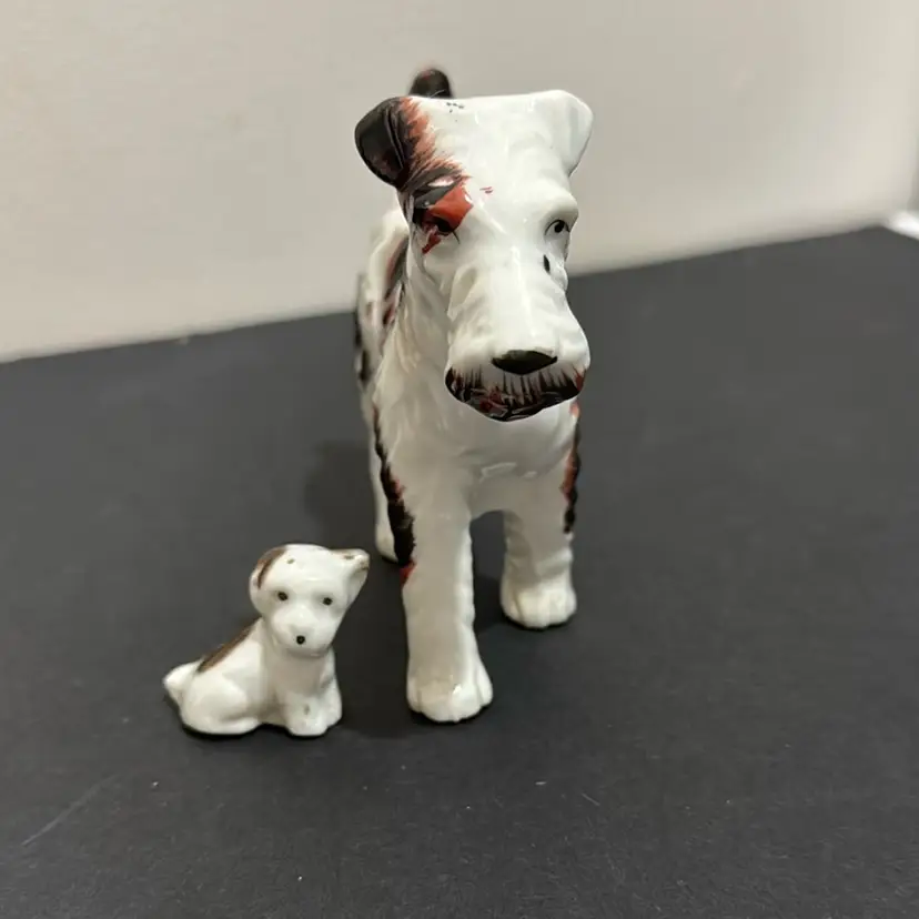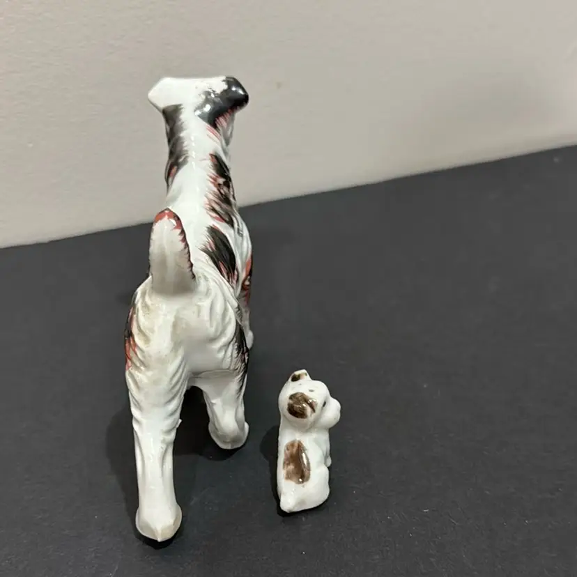 Cute pair of ceramic dog figurines. Largest measures 3 1/2 inches tall and puppy is about an inch. Made in Japan. Great gift for any dog lover!