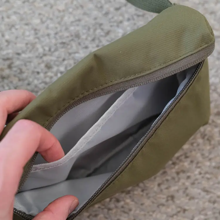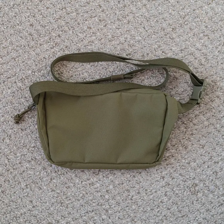 Lightweight olive green 1 liter sling with 0.75 inch strap and an internal slip pocket divider.