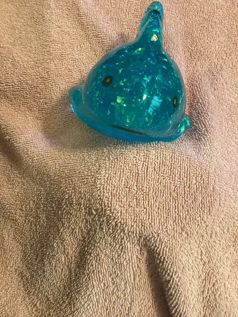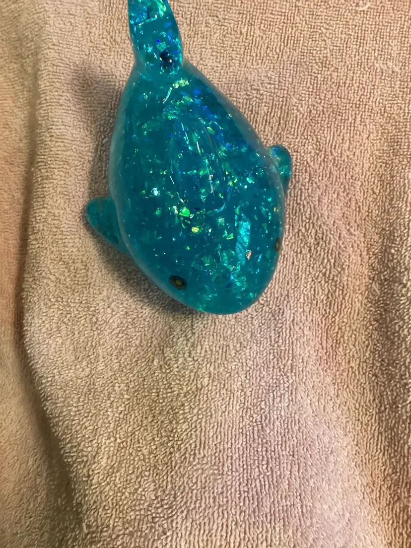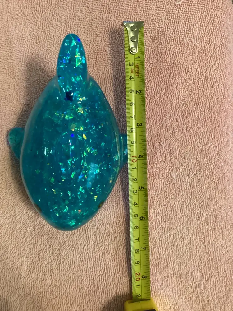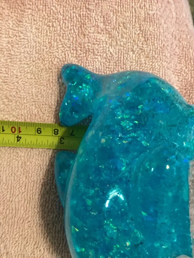Turquoise blue with glitter inside. 5 inches tall, 3 1/2 inches wide and 5 inches long.