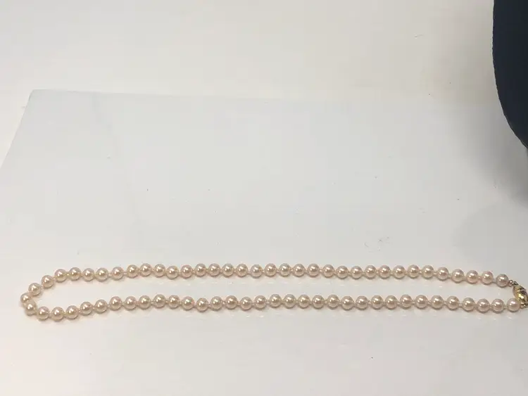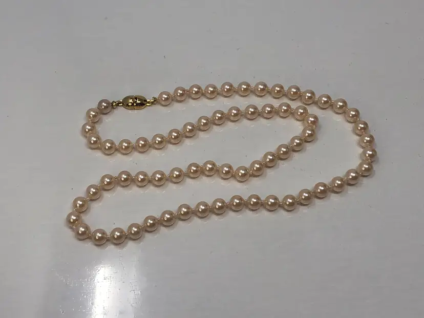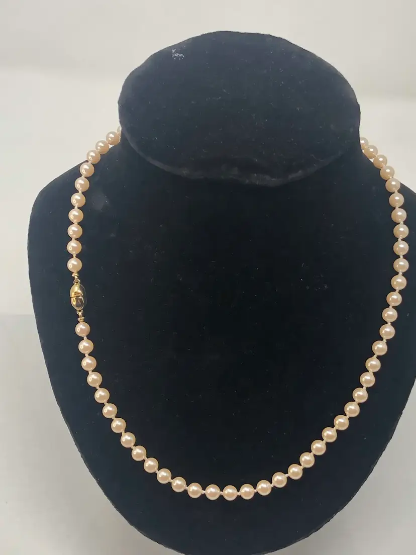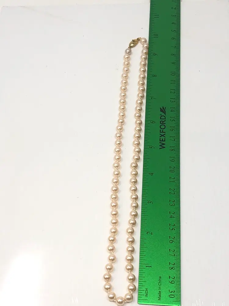 18" faux pearl necklace knotted between each bead. Shiny ivory color with gold tone clasp marked Monet