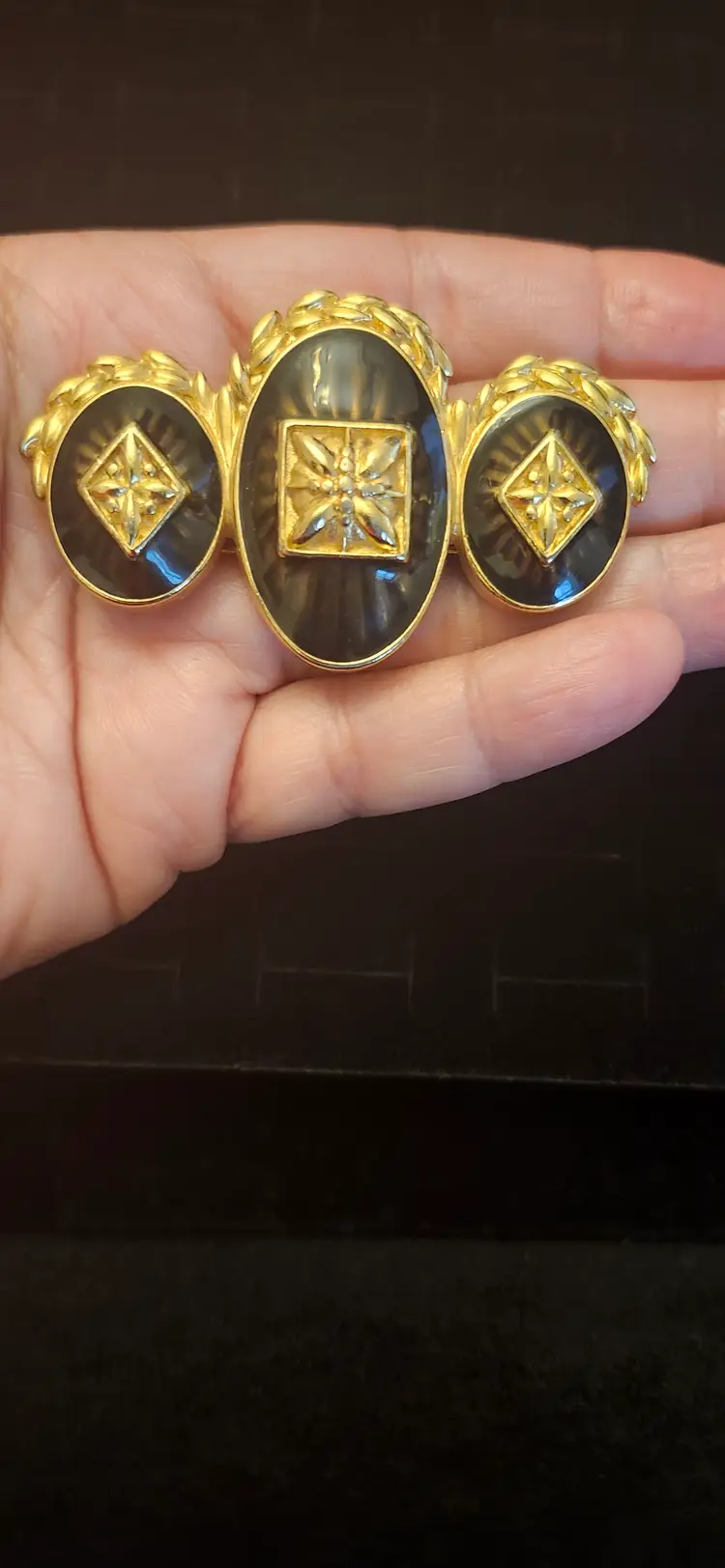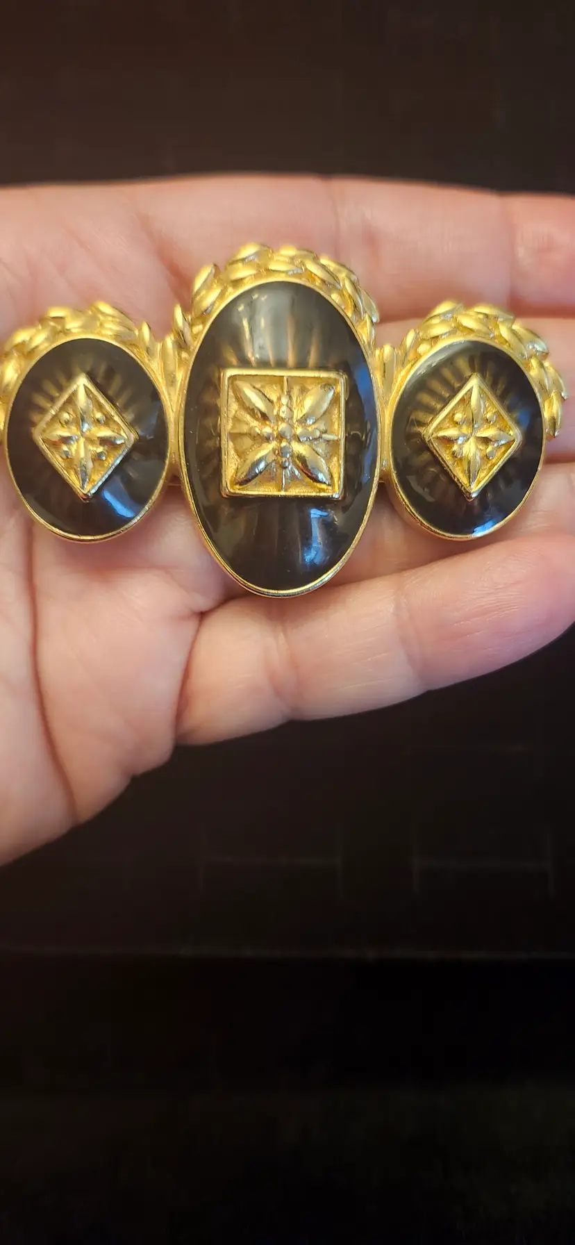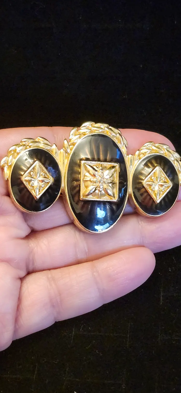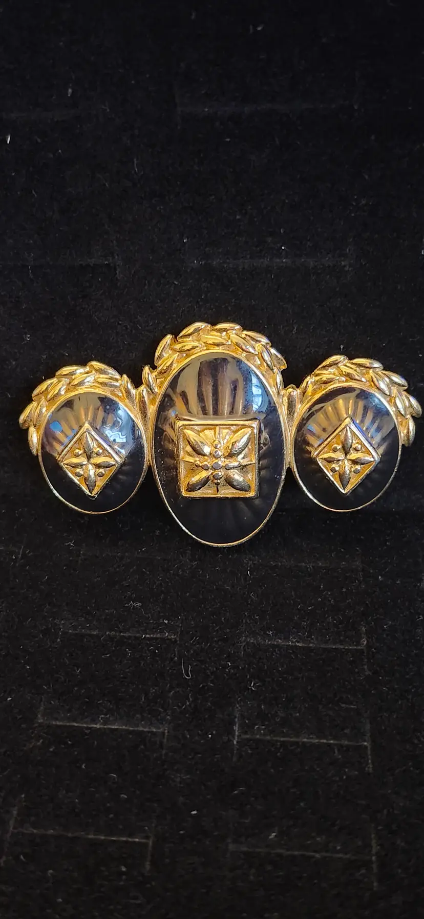 . This particular piece is identified as a "Monet Black Enamel and Gold Tone Three ovals bar Vintage Brooch". S ◦ Brand: Monet, a well-known name in vintage costume jewelry, particularly recognized for its gold-plated pieces. g . Design: The brooch features three interconnected oval sections with black enamel and gold-tone detailing, including a laurel leaf-like edge and a central square design with a floral or starburst pattern. Materials: :Itis made of gold-tone metal with black enamel accents.