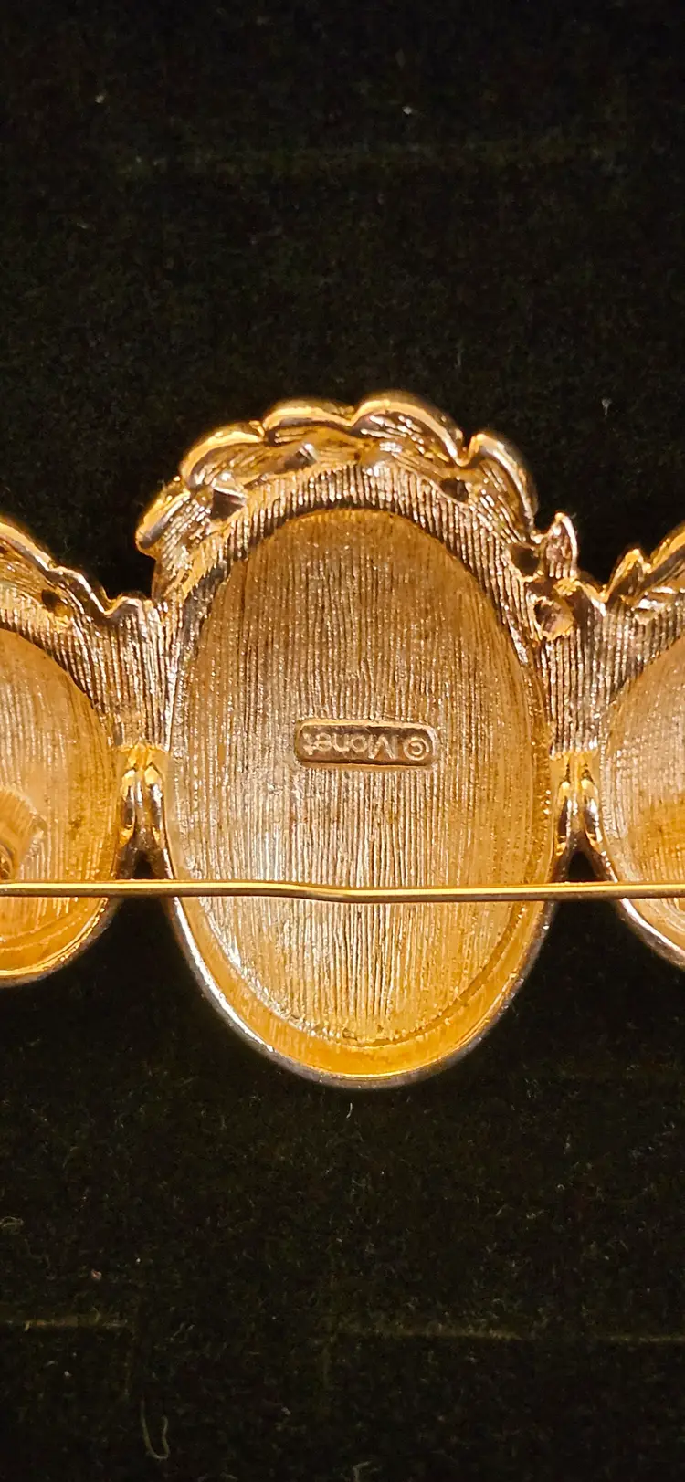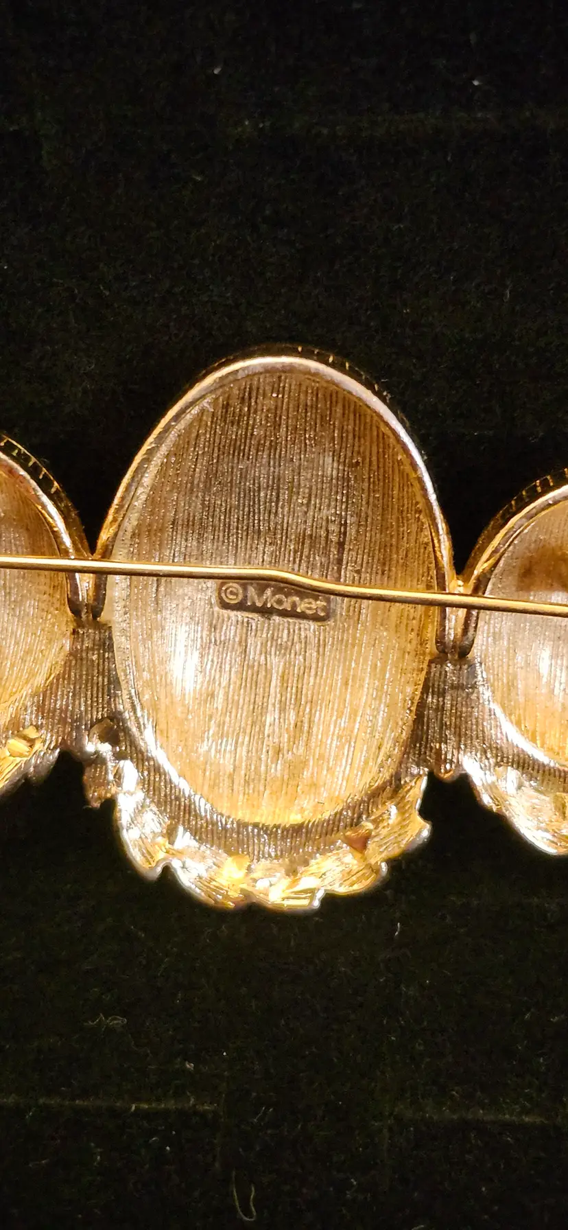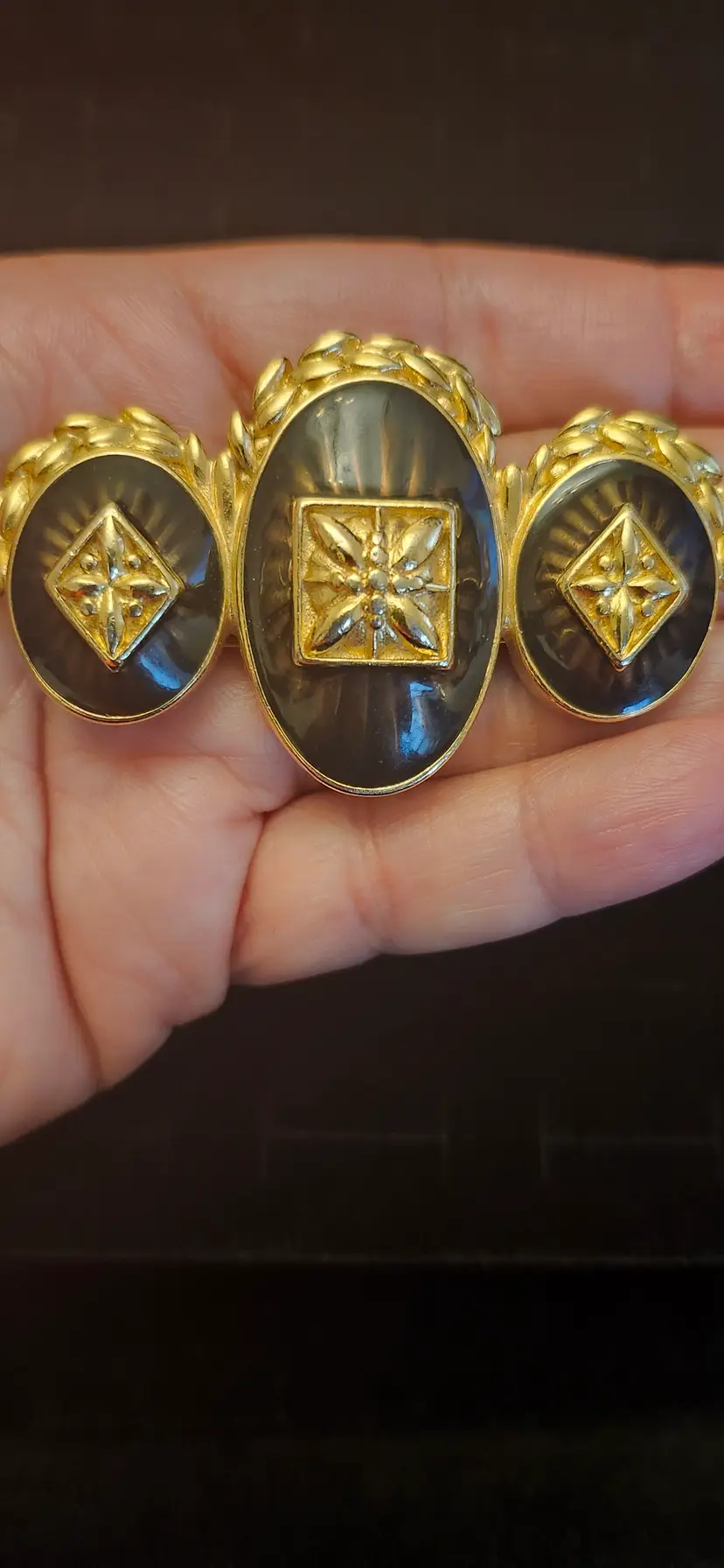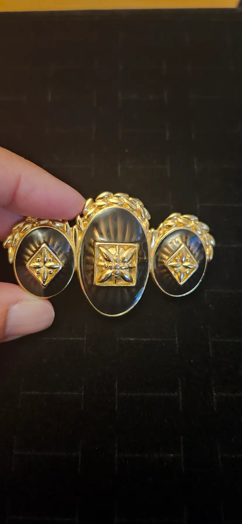 . This particular piece is identified as a "Monet Black Enamel and Gold Tone Three ovals bar Vintage Brooch". S ◦ Brand: Monet, a well-known name in vintage costume jewelry, particularly recognized for its gold-plated pieces. g . Design: The brooch features three interconnected oval sections with black enamel and gold-tone detailing, including a laurel leaf-like edge and a central square design with a floral or starburst pattern. Materials: :Itis made of gold-tone metal with black enamel accents.