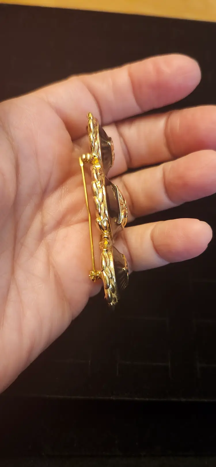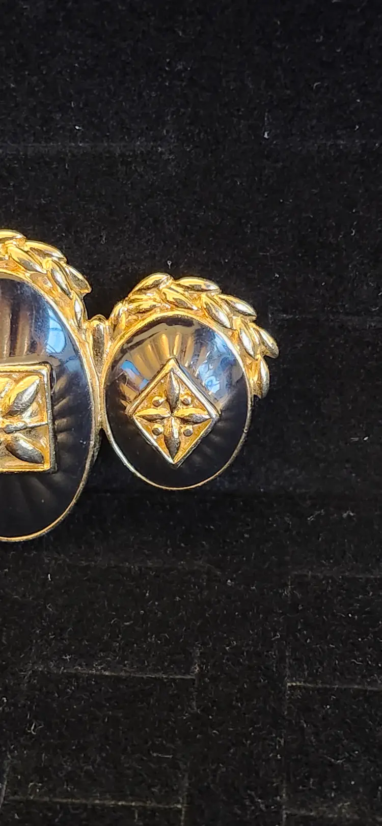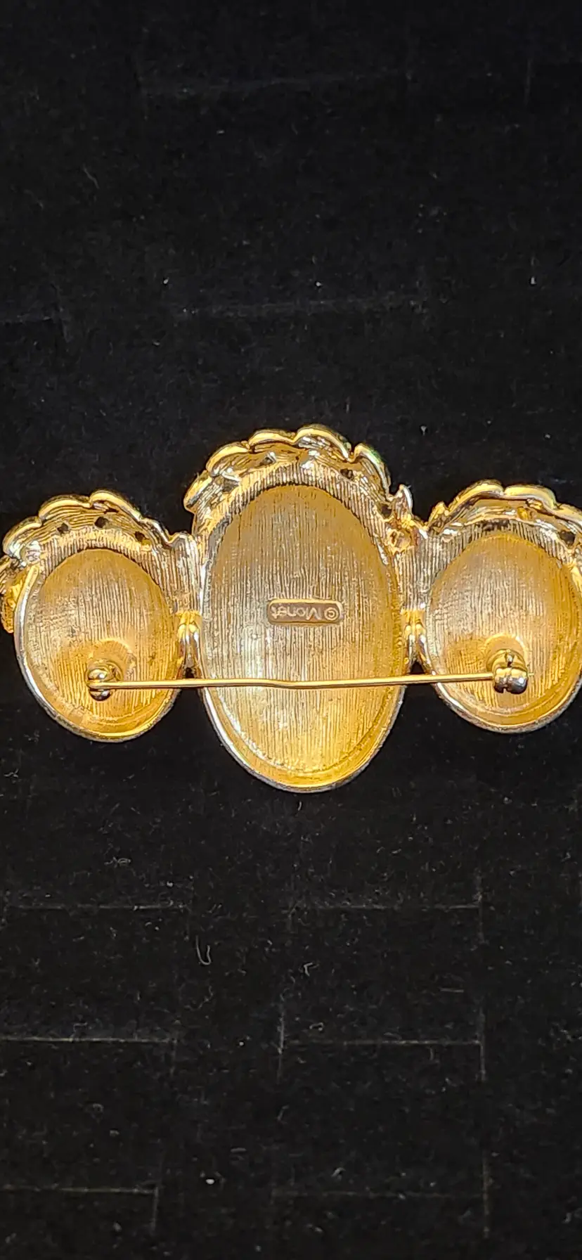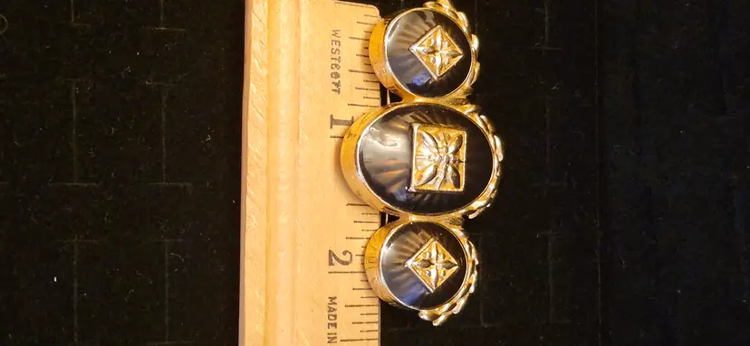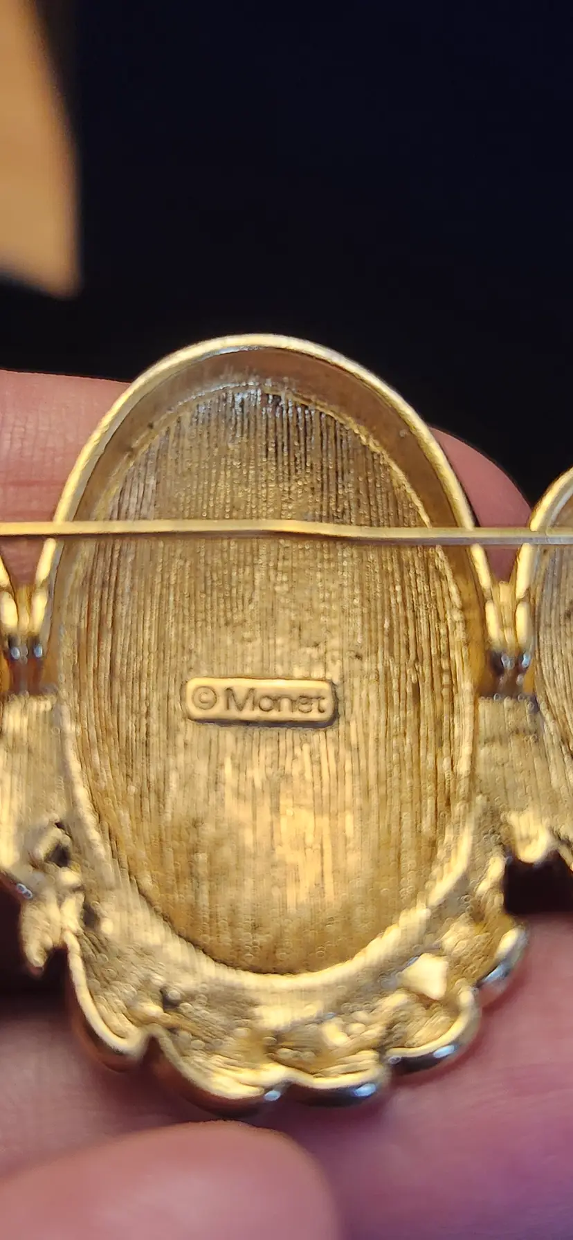 . This particular piece is identified as a "Monet Black Enamel and Gold Tone Three ovals bar Vintage Brooch". S ◦ Brand: Monet, a well-known name in vintage costume jewelry, particularly recognized for its gold-plated pieces. g . Design: The brooch features three interconnected oval sections with black enamel and gold-tone detailing, including a laurel leaf-like edge and a central square design with a floral or starburst pattern. Materials: :Itis made of gold-tone metal with black enamel accents.