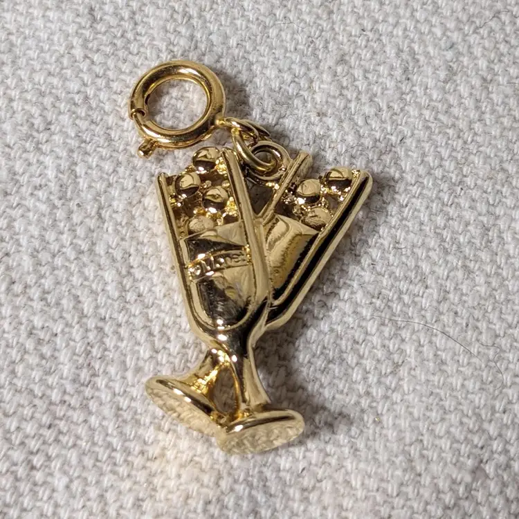 Goldtone champagne glass charm with rhinestone 'bubbles'. Signed Monet. Lobster clasp. Metal is not tested.