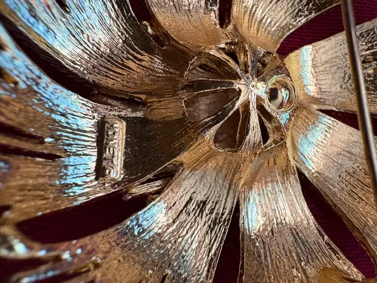 Monet Cordelia Brooch Gold tone design of twisted fringes giving a sunburst effect Designed by Roy Miazzi Produced from 1960 through 1980s Measures 2 1/2 inches