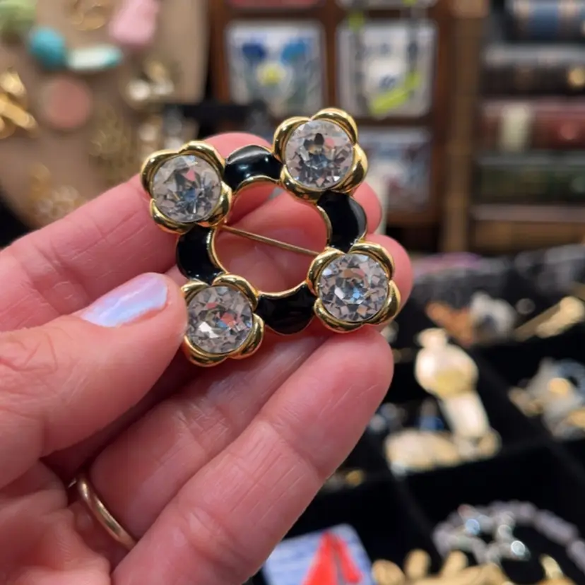 Monet Goldtone Black Enamel Faceted Rhinestone Brooch 1.75”