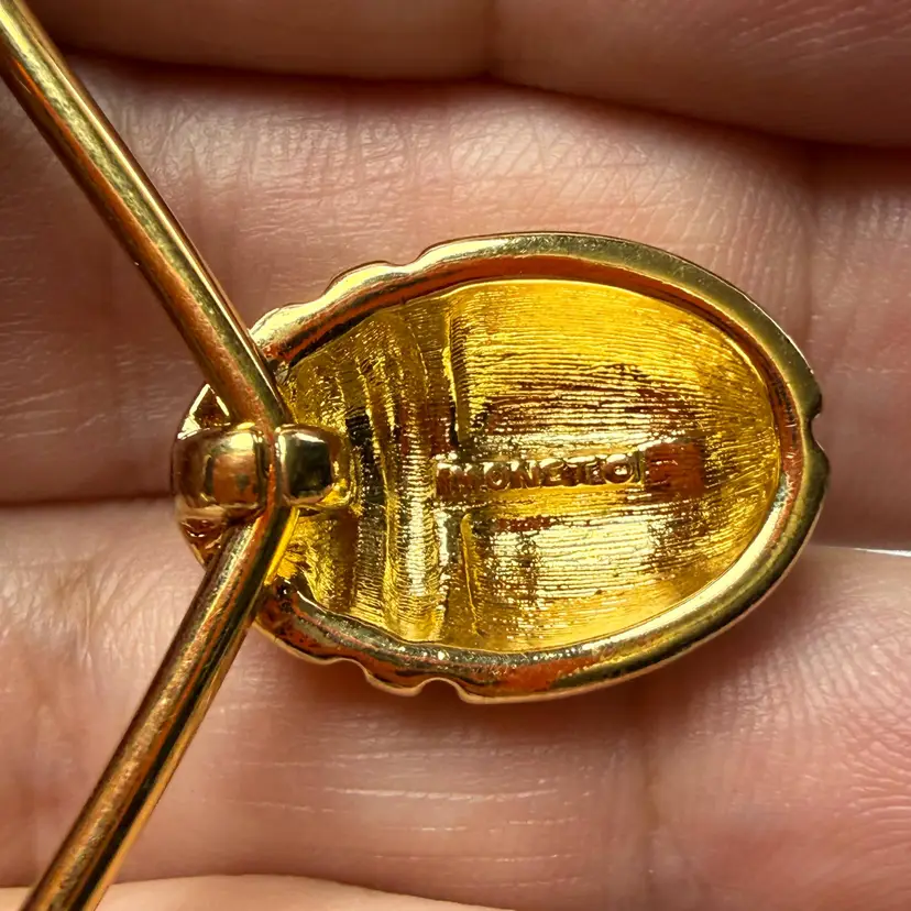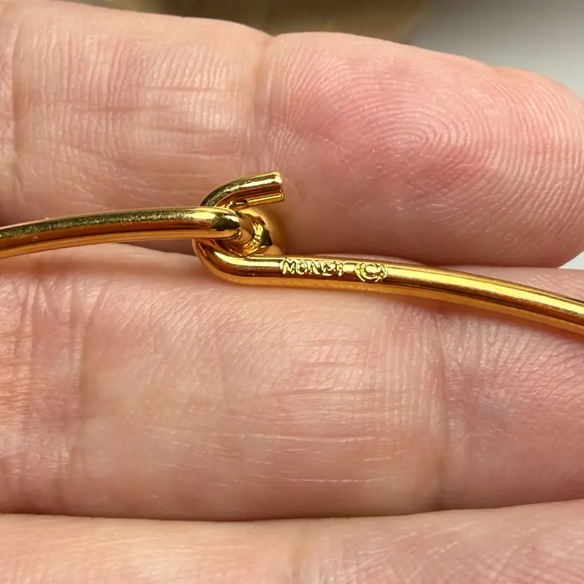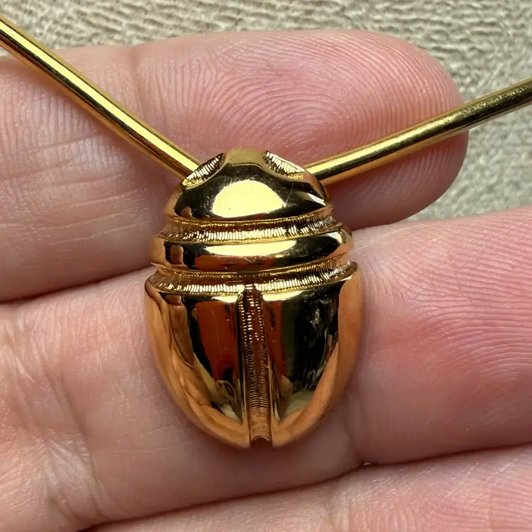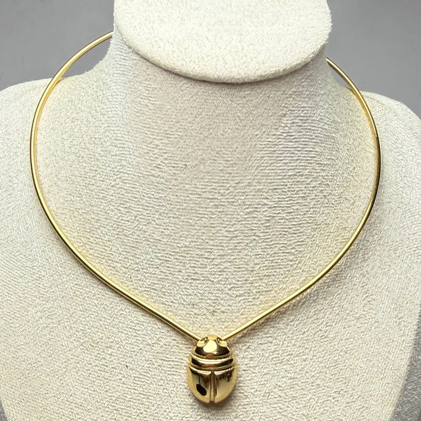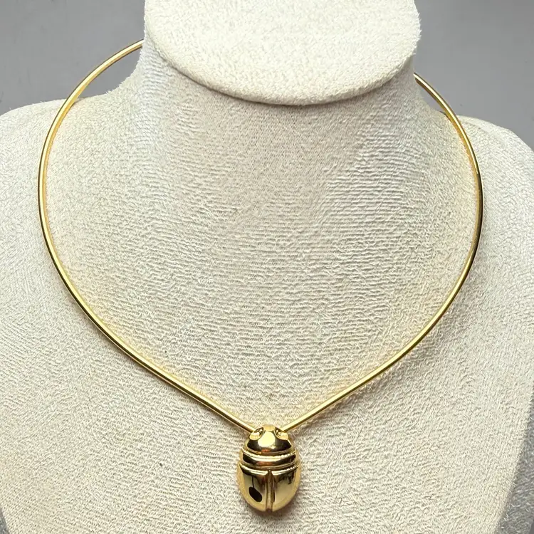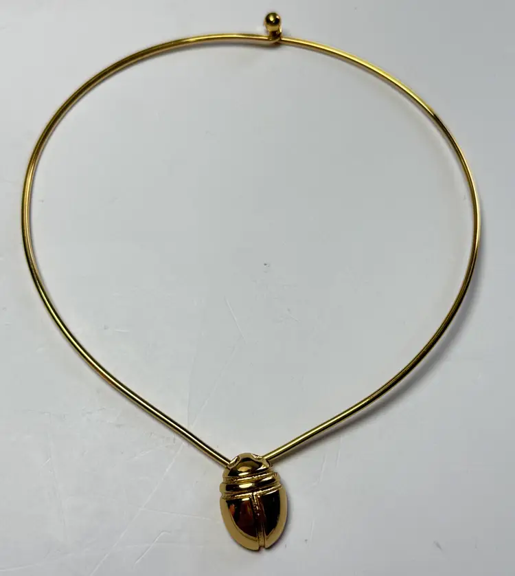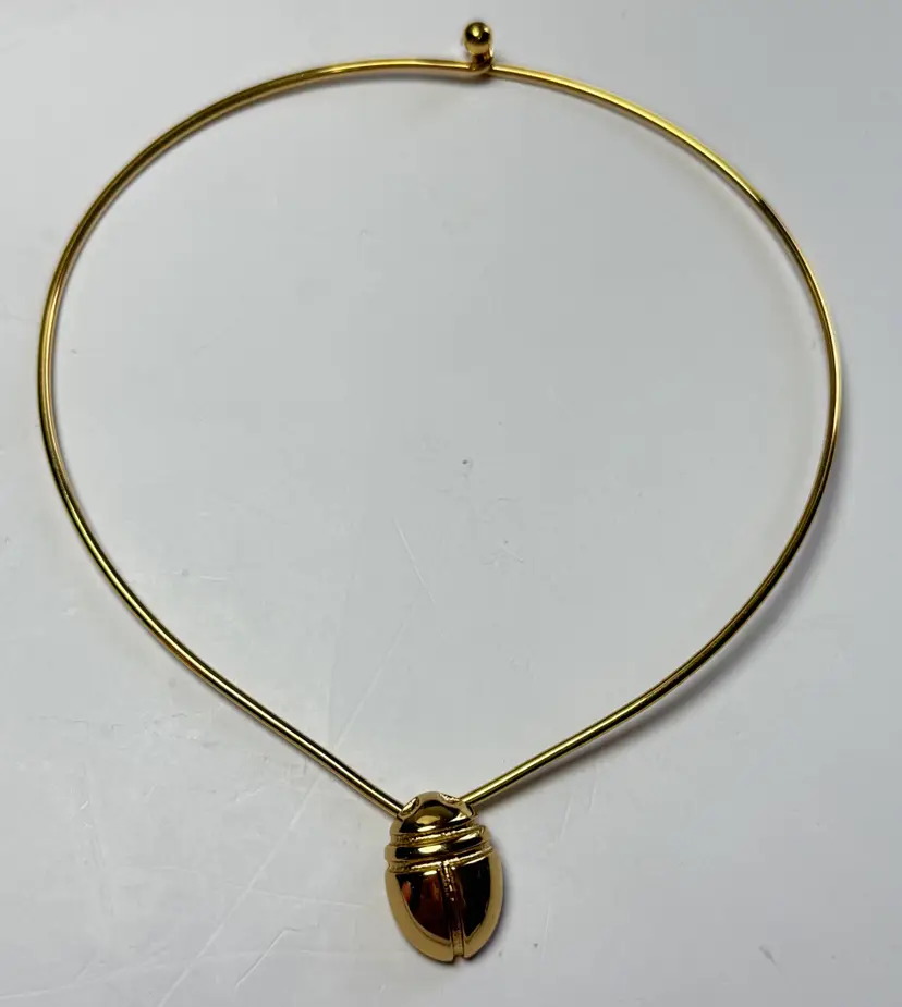 Monet Scarab Slide Pendant Choker Collar Necklace Egyptian Revival Gold Tone. Excellent condition. Little to no wear. Ball and loop closure. Signed.
