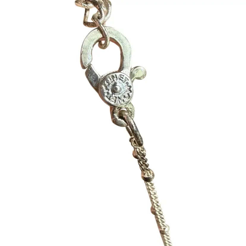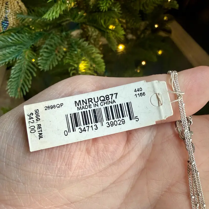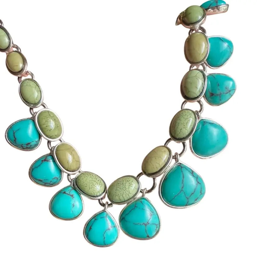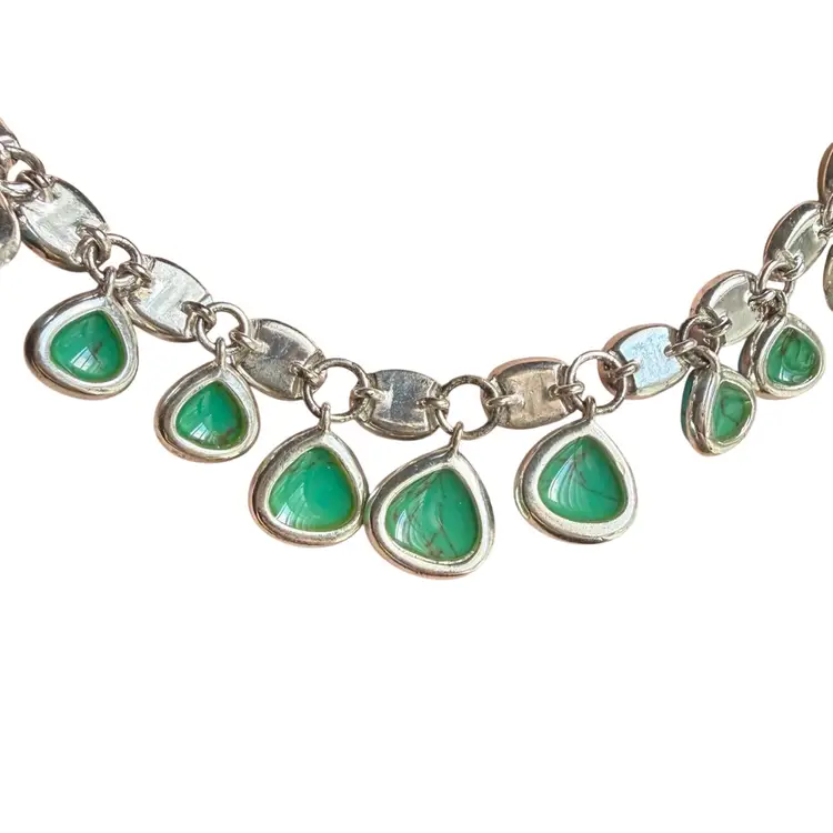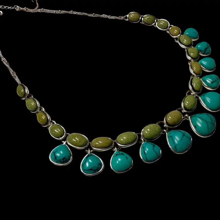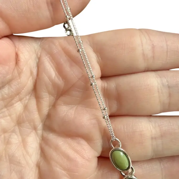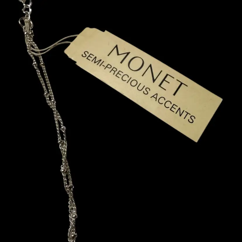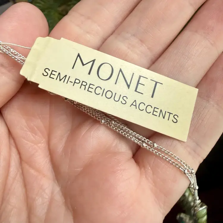 18”. Monet semi precious stone silver tone necklace. Features green and aqua stones in a “bib style”, with a delicate double chain which has scattered small silver bead detail. Includes original tag. Marked Monet on clasp.