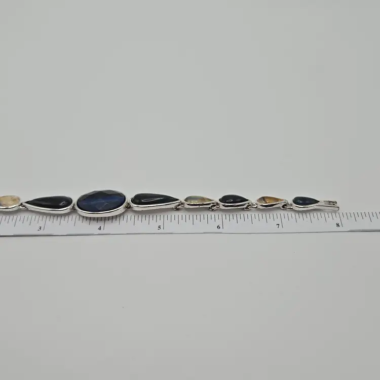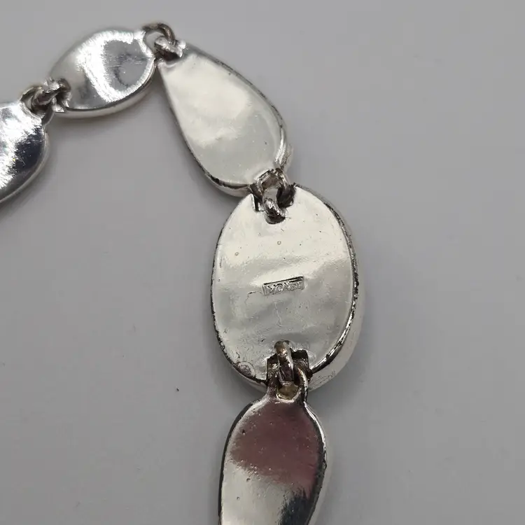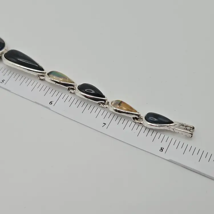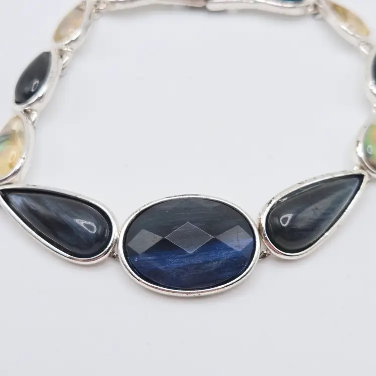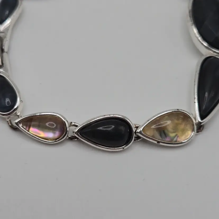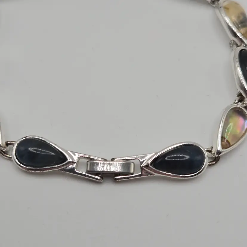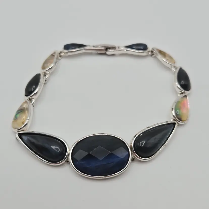 Elegant Monet bracelet featuring faceted dark blue stones paired with mother of pearl inlays, set in silver tone metal. Measures about 8" long with secure clasp. A stylish vintage-inspired piece with Monet quality craftsmanship, ready to wear or gift. Does show signs of wear.