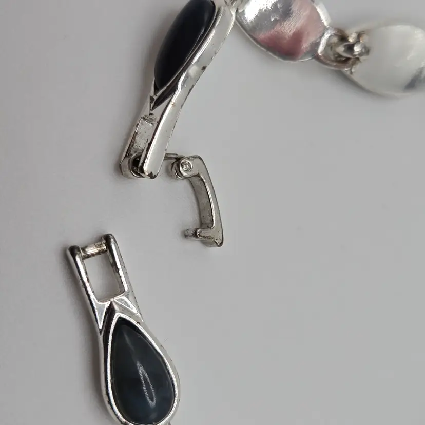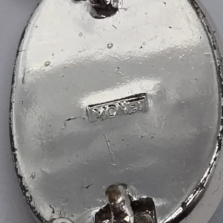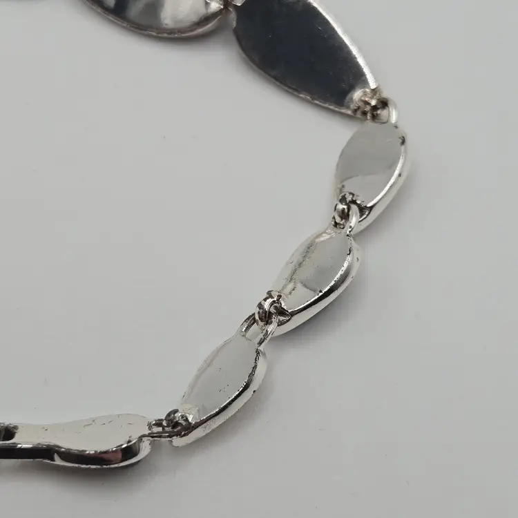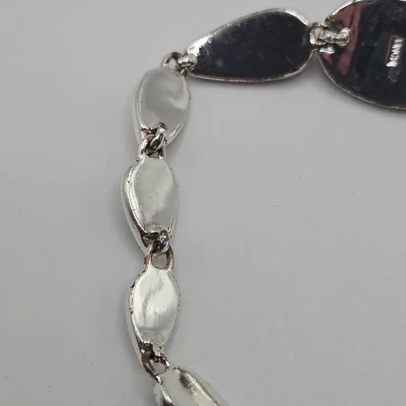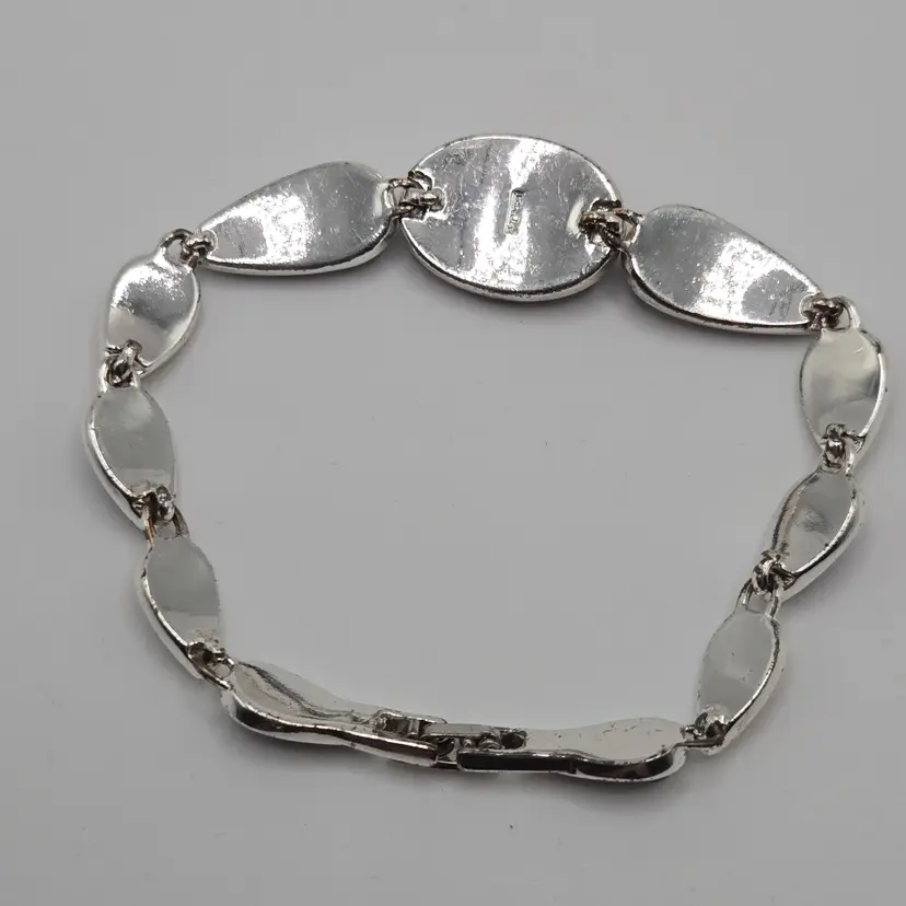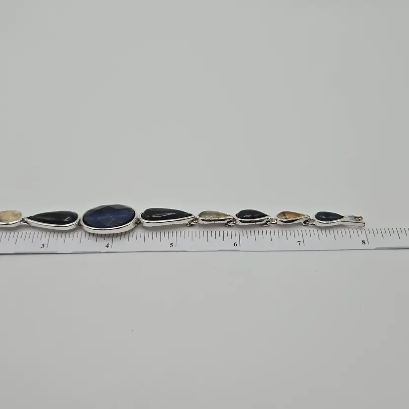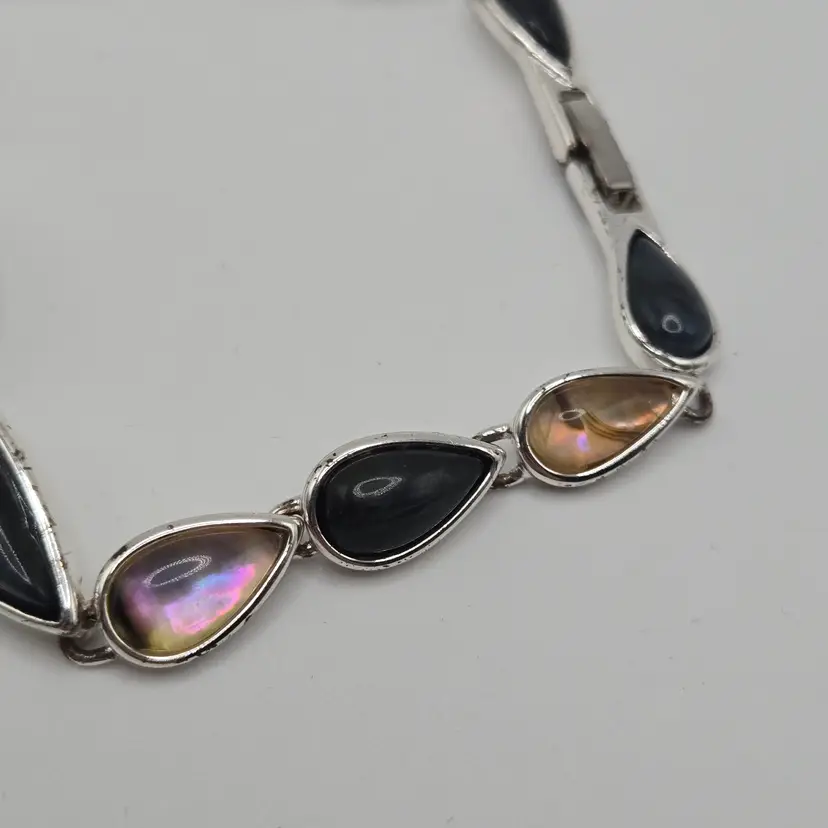 Elegant Monet bracelet featuring faceted dark blue stones paired with mother of pearl inlays, set in silver tone metal. Measures about 8" long with secure clasp. A stylish vintage-inspired piece with Monet quality craftsmanship, ready to wear or gift. Does show signs of wear.