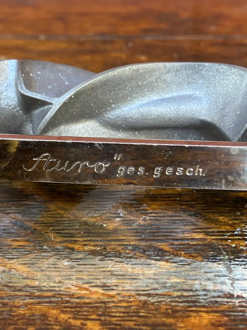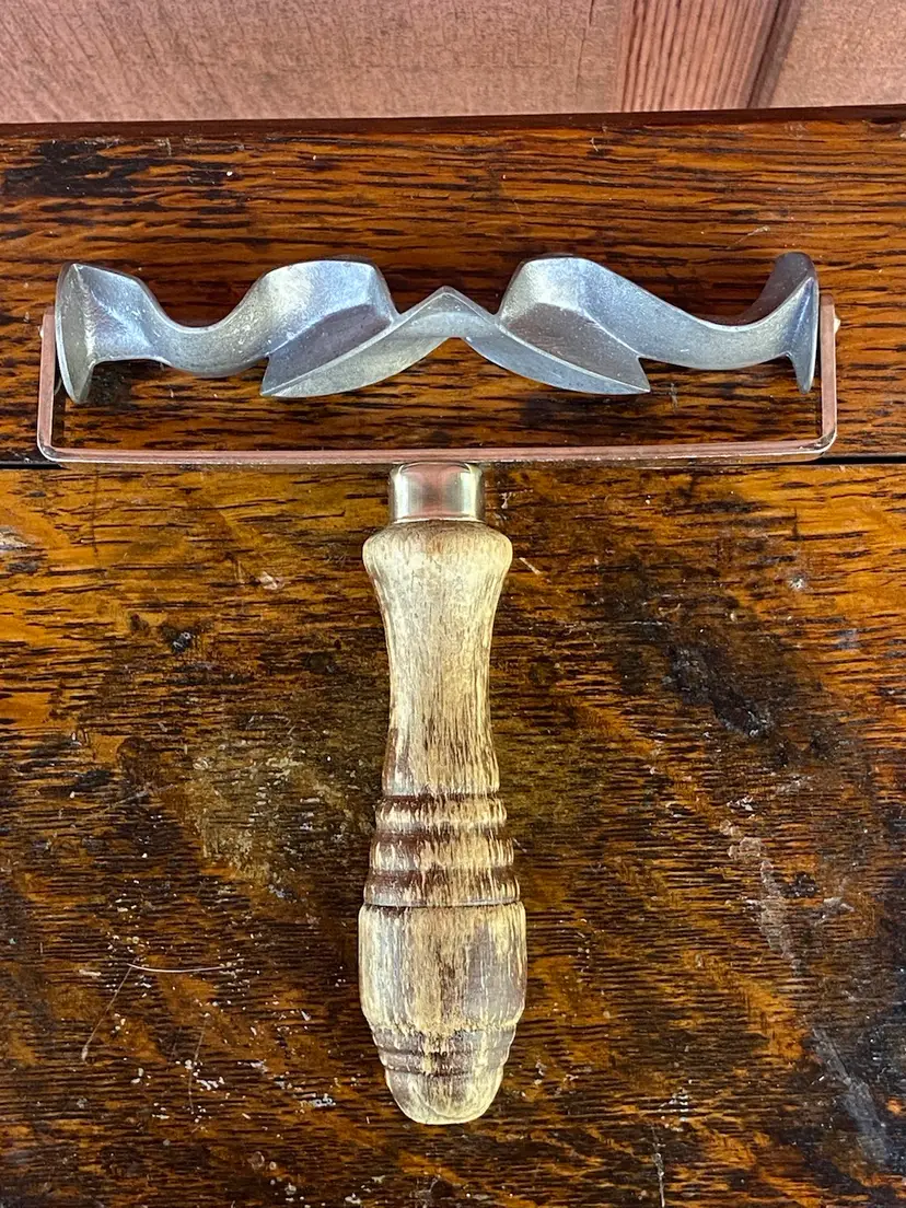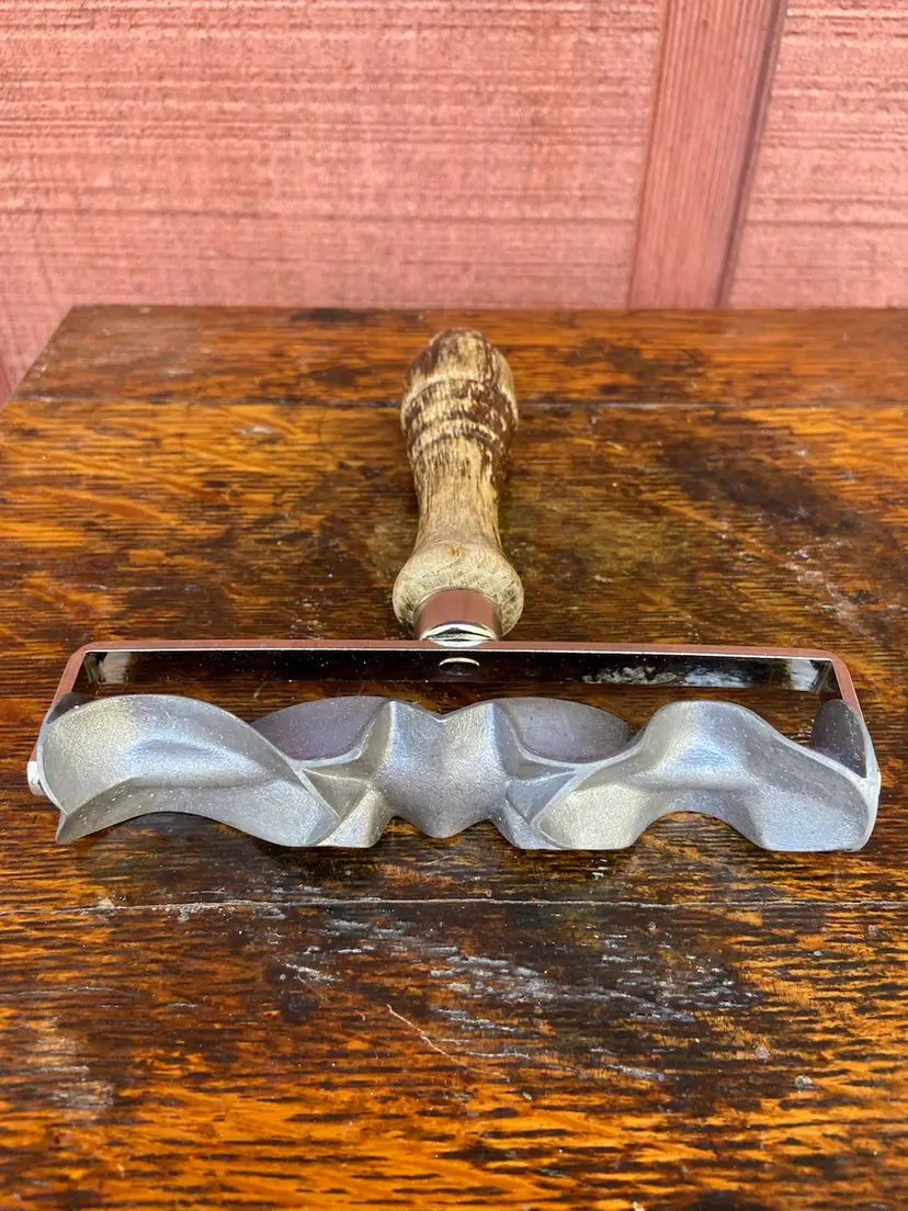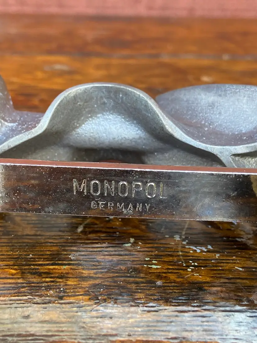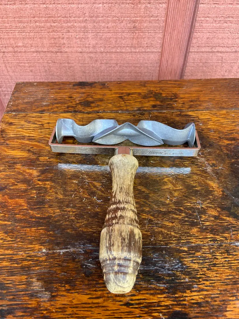 Approx 6.5l x 6w x 1.25h. Metal cookie rolling cutter with wooden handle. Monopol Auro ges gesch. Made in Germany. Paint on handle is worn. No apparent rust on cutter.