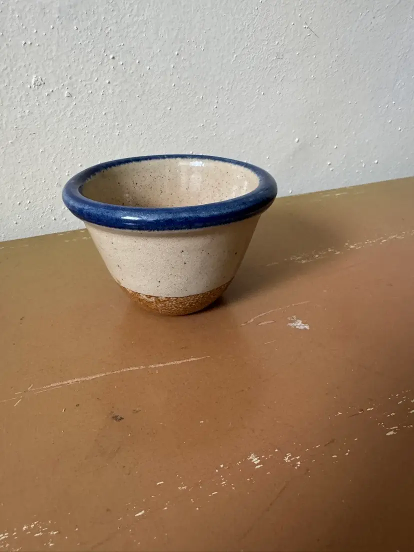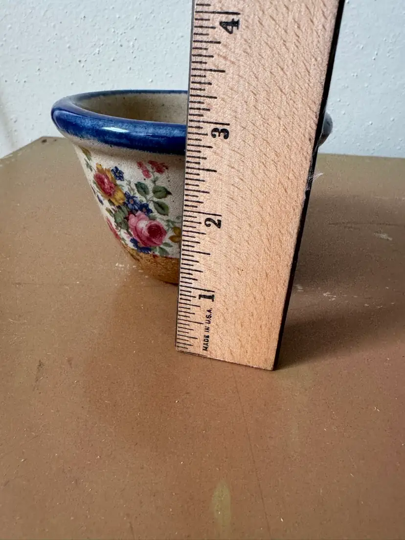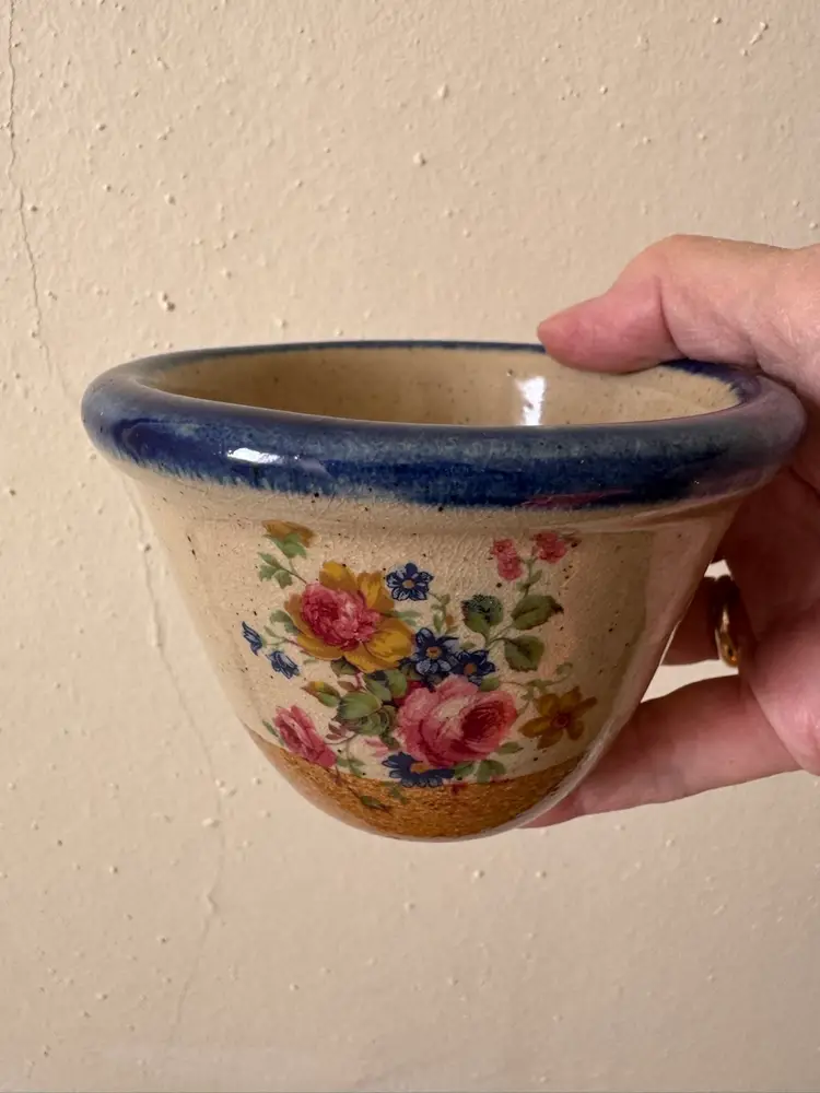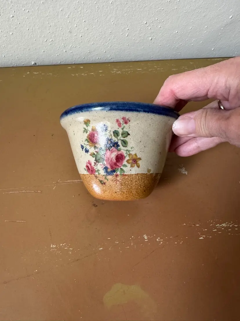 Monroe Saltworks 3” custard cup with blue rim and flowers design. Vintage.