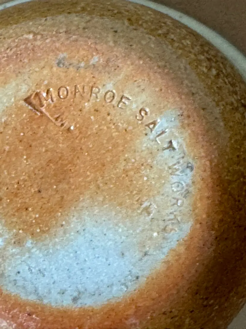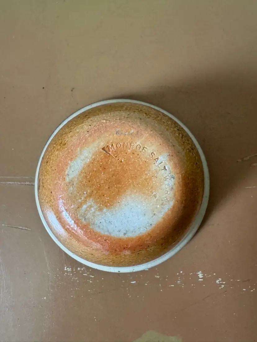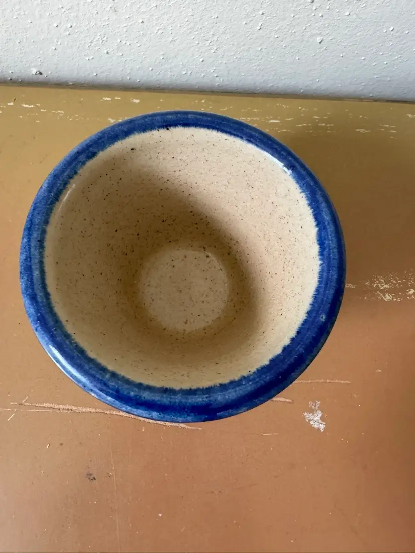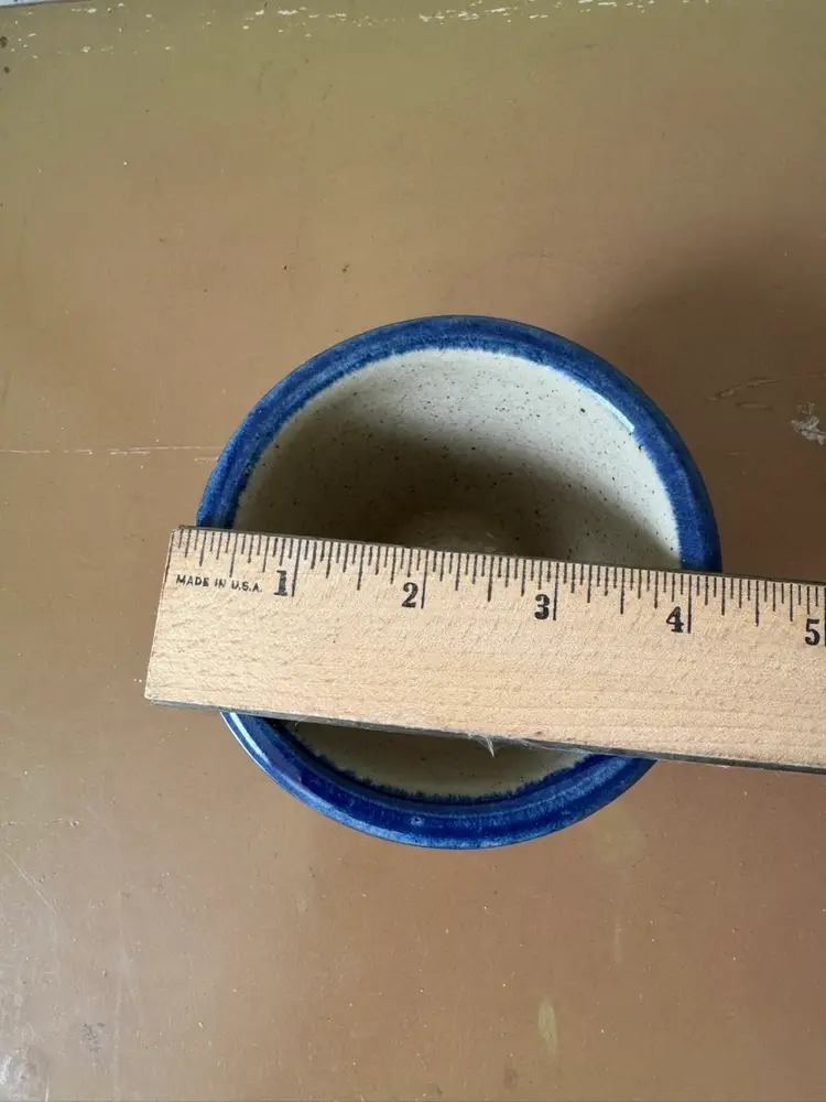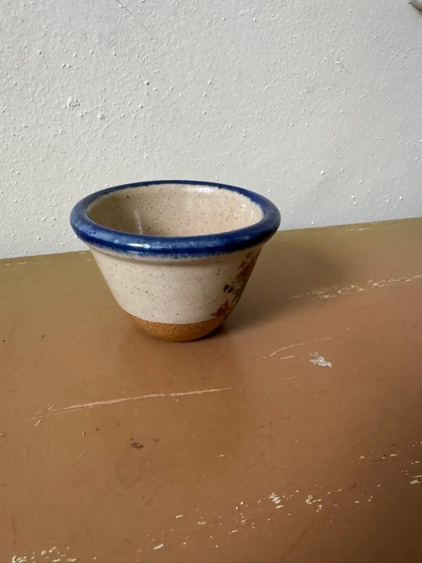 Monroe Saltworks 3” custard cup with blue rim and flowers design. Vintage.