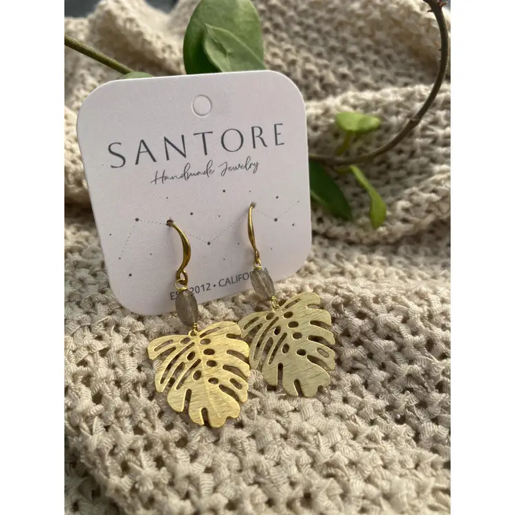 Brushed Monstera Leaf charms hang with subtly gorgeous labradorite gemstones. The leaves have a glistening brushed textured finish and catch the light beautifully.