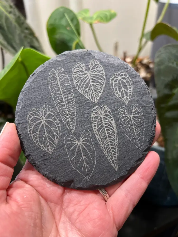 A clean, modern coaster crafted from natural slate and laser-engraved with a minimalist Anthurium leaf design. Measures 4” in diameter and 1/4” thick. Felt pads on the bottom protect surfaces and keep the coaster in place.
