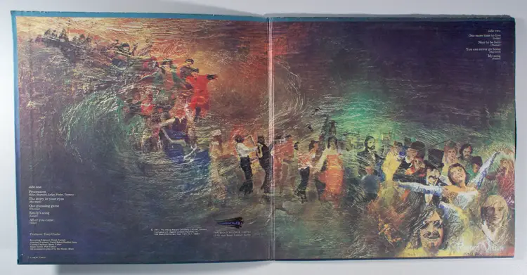 Vinyl plays with occasional light-crackles (play-graded). Textured gate-fold cover has a few creases near edges; light-scuffing, and surface impressions (front/back/inner-gate). Inner-sleeve is original (lyrics/photo). Spine is mostly readable with noticeable wear (printed off-center). Heavy shelf-wear along top/bottom and corners. Opening is crisp with signs of light use and divots. "BW" suffix on label. (Not a cut-out.)