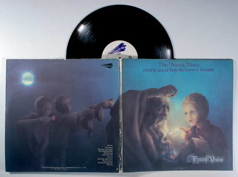 Every Good Boy Deserves Favour, by the Moody Blues, reached No. 1 on the British album charts, in addition to a three week stay at No. 2 in the United States, and produced one top-40 single, The Story in Your Eyes. The album was the last to feature only the Mellotron, as it would be assisted by the Chamberlin (another device that uses recorded tape to generate sound) on the Moody Blues' next studio album, 1972's Seventh Sojourn. Every Good Boy Deserves Favour featured the only track to be written by all five members of the band; the opening Procession was a piece that was intended to describe the history of music from the beginning of time up until the album's recording. The only three words heard in this track --"desolation," "creation," and "communication"—were similarly used (along with many other "-ation" words) in One More Time to Live. The track Emily's Song was written by John Lodge for his newborn daughter. The title of the album is taken from the student mnemonic for the lines of the treble clef: E-G-B-D-F. These notes are heard played on piano during Procession. The front cover has been imitated by the leader of the dark progressive band Current 93, David Tibet, with a drawing he has made up in order that it could appear on the cover of Halo, a live album released in 2004.