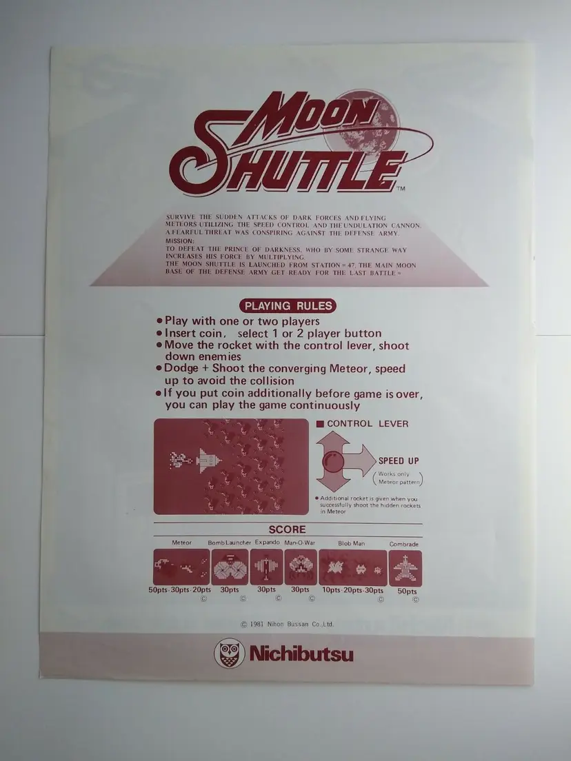 Arcade: Flyer Modified Item: No Country/Region of Manufacture: United States Original/Reproduction: Original Year: 1981 Game Title: Moon Shuttle Brand: Nichibutsu